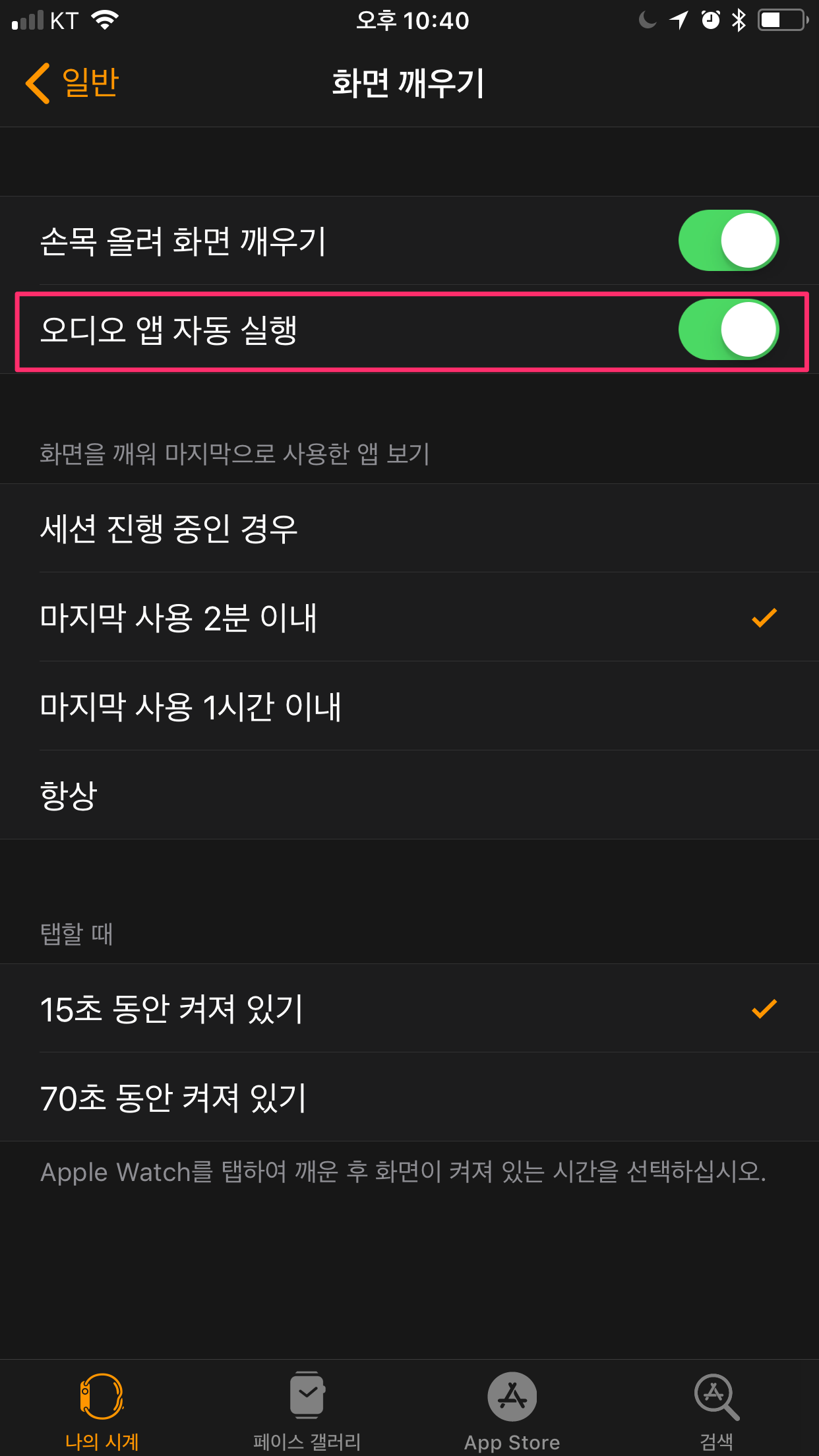 오디오 앱 자동실행 비활성화 하면 애플워치에서 음악을 들을 때 지금 재생 중 화면이 꺼집니다.