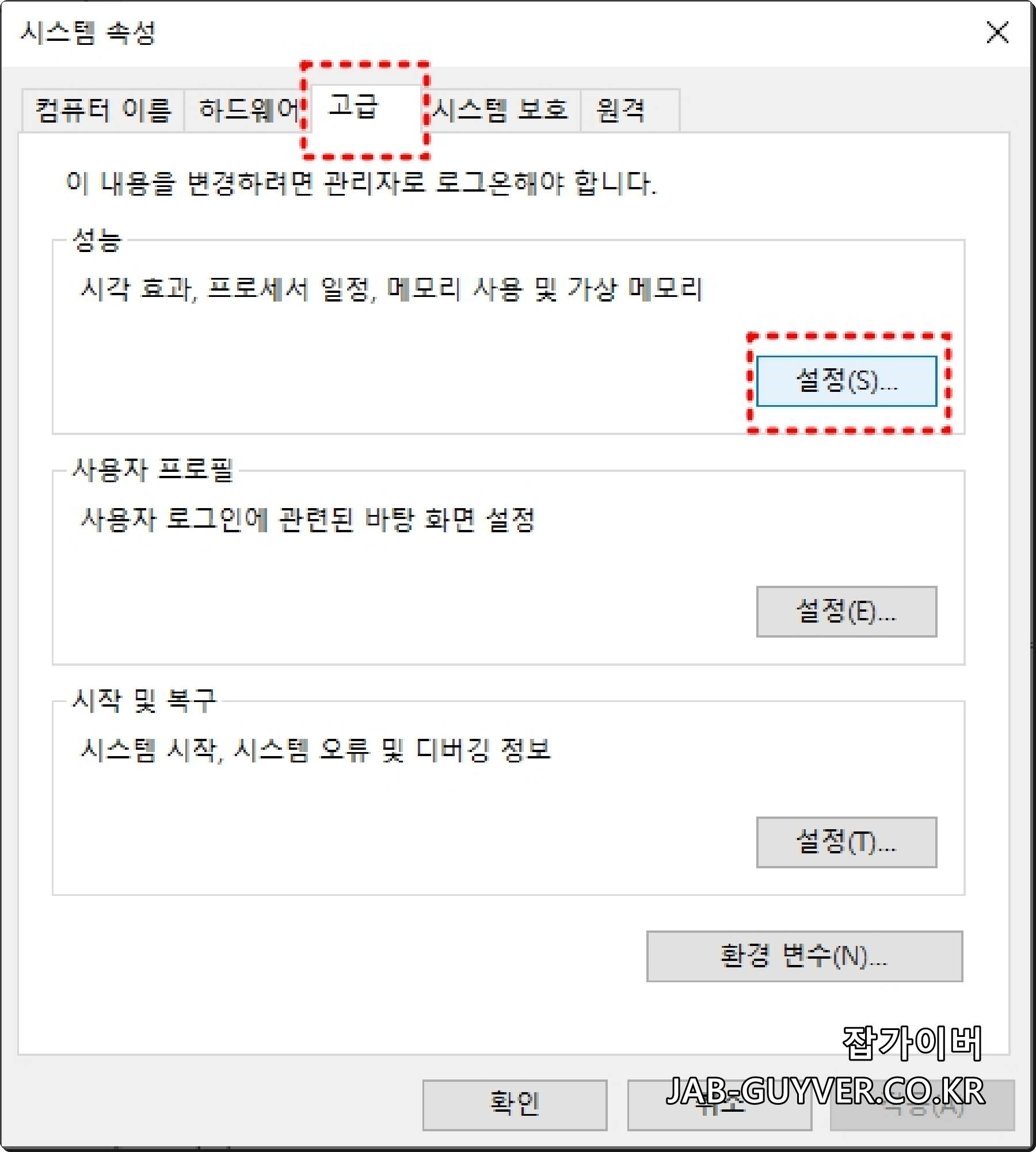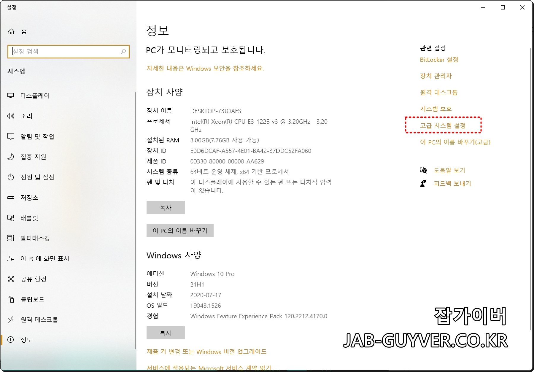 왼쪽 메뉴에서 "고급 시스템 설정" 선택합니다