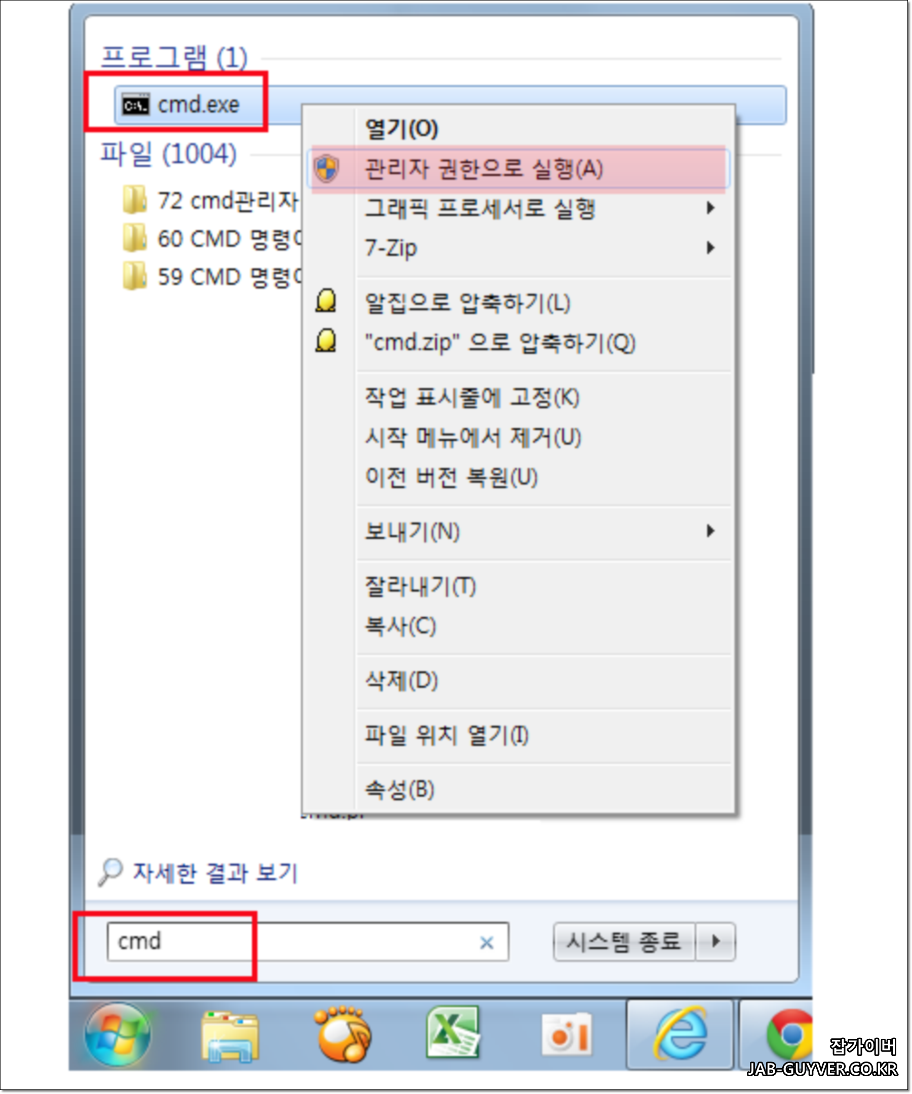 시작 -> 명령 프롬프트 -> 관리자권한으로 실행합니다.