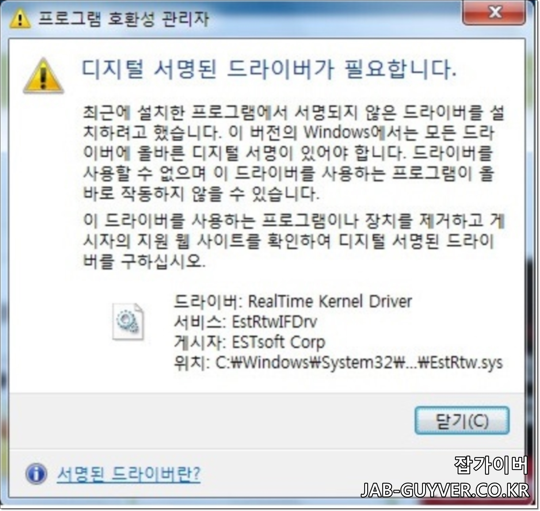 이 드라이버를 사용하는 프로그램이나 장치를 제거하고 게시자의 지원 웹 사이트를 확인하여 디지털 서명된 드라이버를 구하십시오