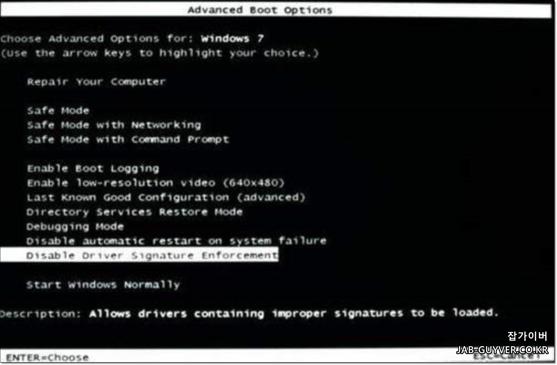 이때 윈도우7 안전모드 부팅이 가능해지며 Diasble Driver Signature Enforcement (디지털 서명 안 함)으로 선택하면 디지털서명 없는 상태로 윈도우 부팅이 가능합니다.
