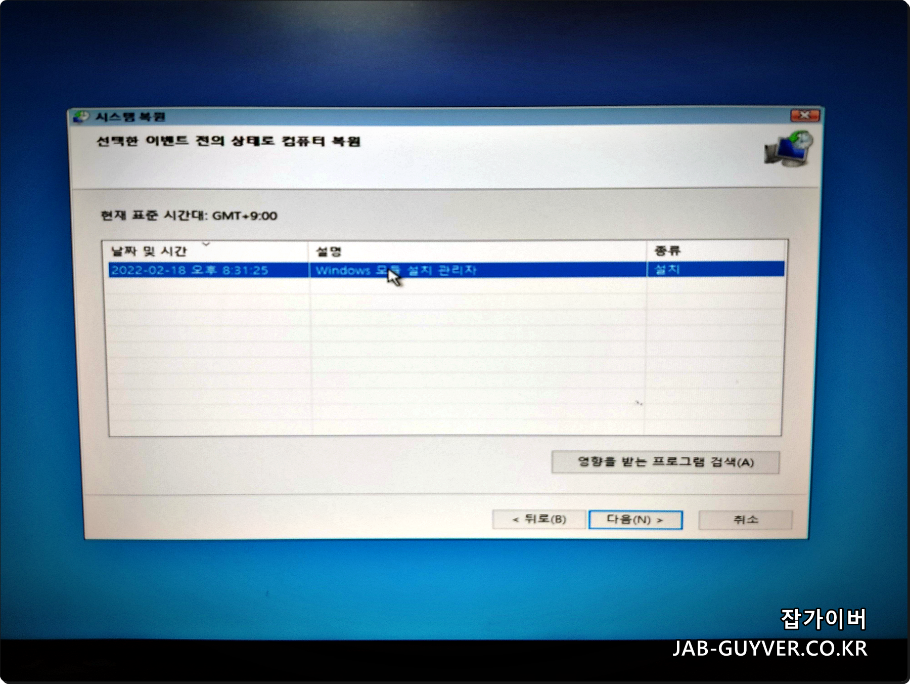 "업데이트 제거" 후에도 문제가 해결되지 않는다면, 시스템 복원 기능을 이용해 이전 복구 지점으로 되돌려 보세요.