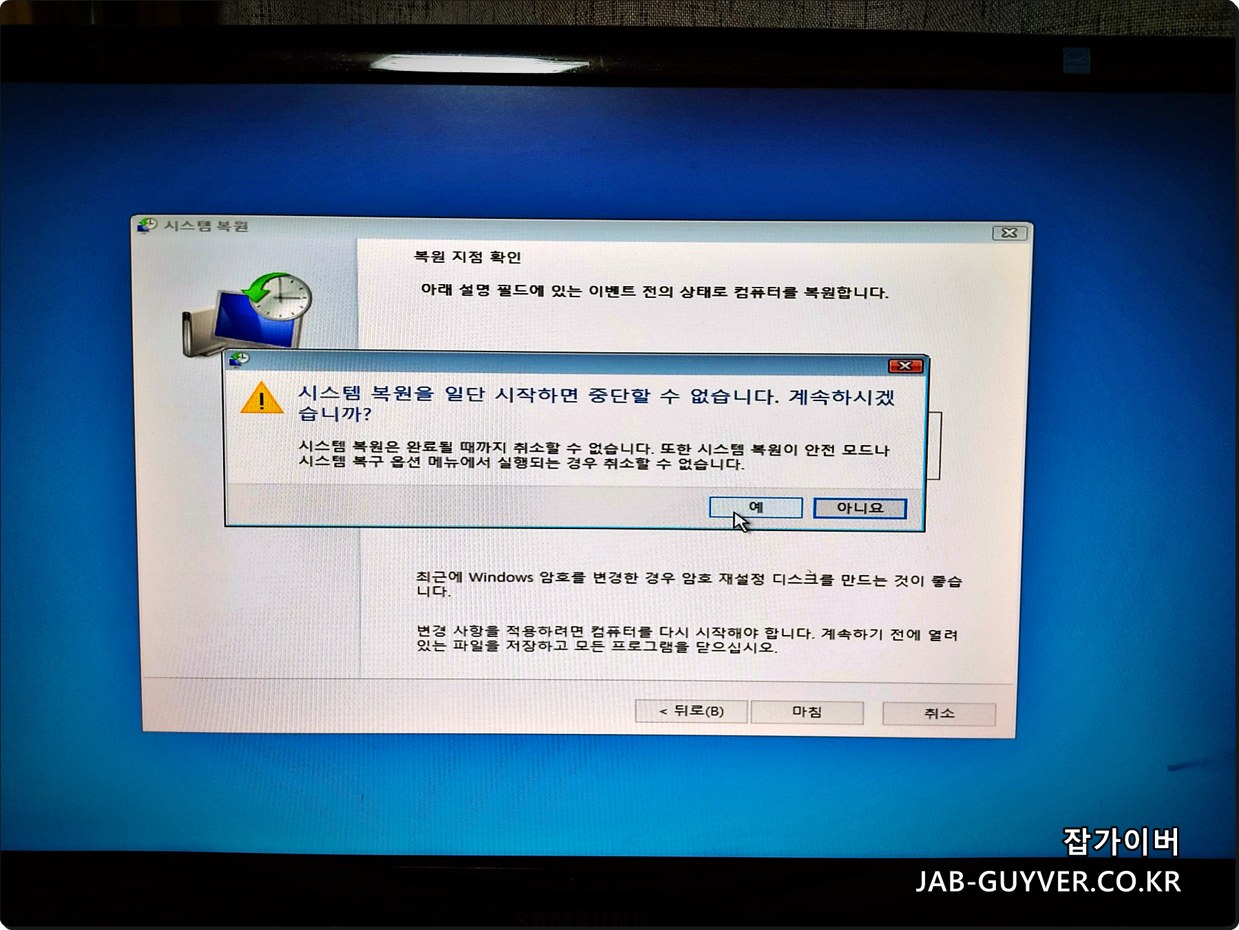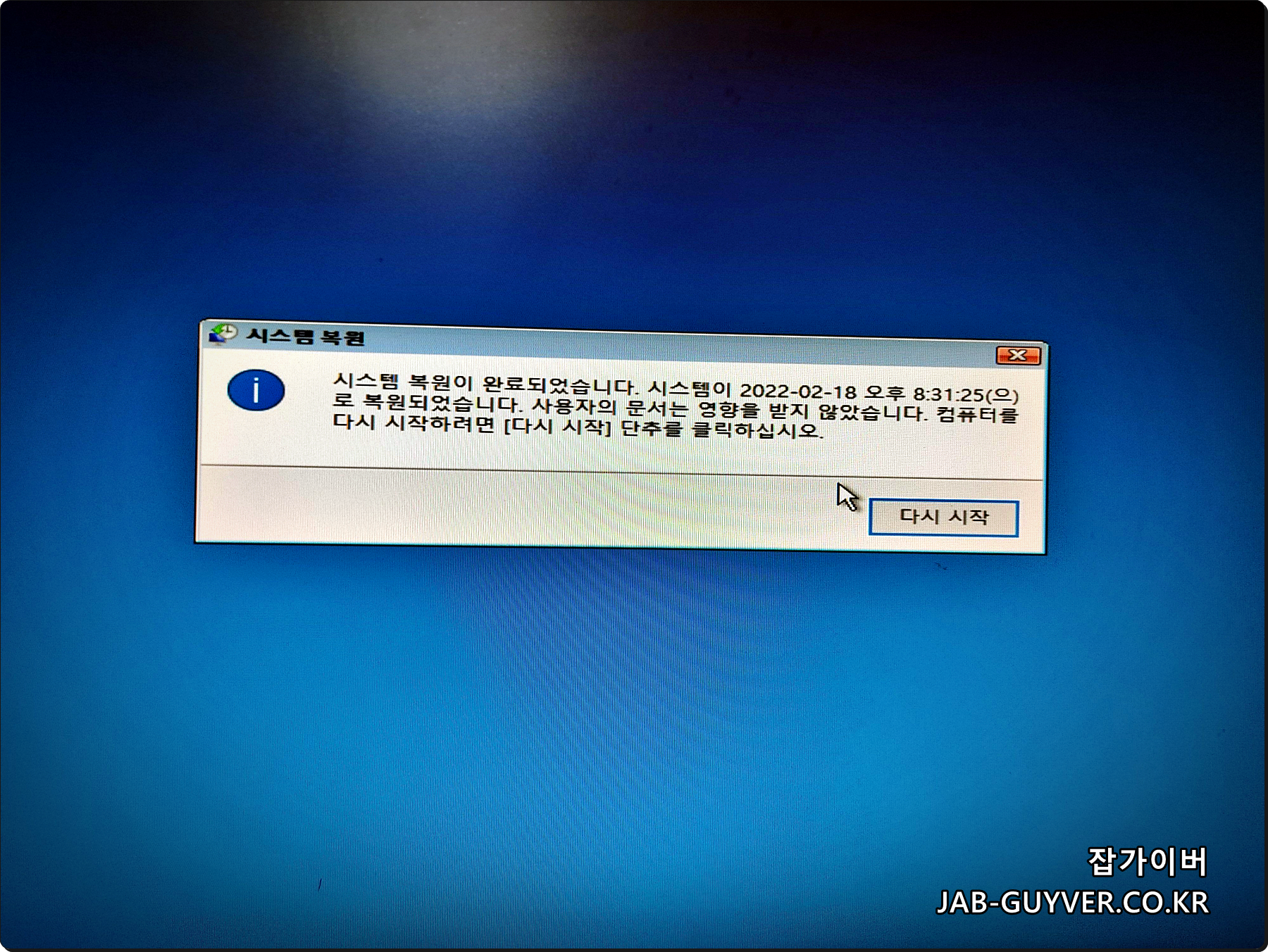 이 후 시스템 복원이 진행되며 이때 과거로 되돌아 가더라도 사용자 문서 및 사진, 바탕화면 아이콘등은 삭제되지 않습니다.