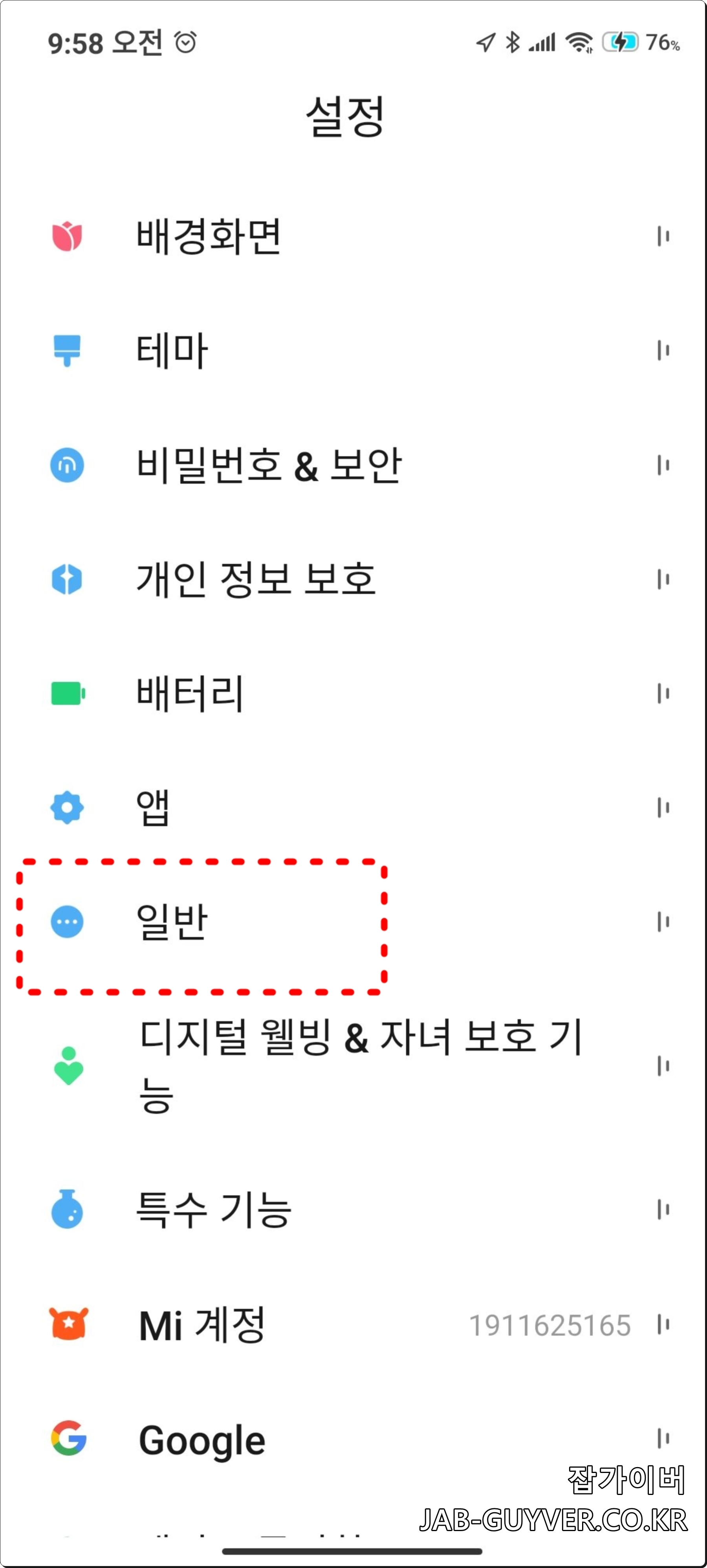 샤오미 핸드폰 설정 -> 일반 -> 터치도우미 들어갑니다.
