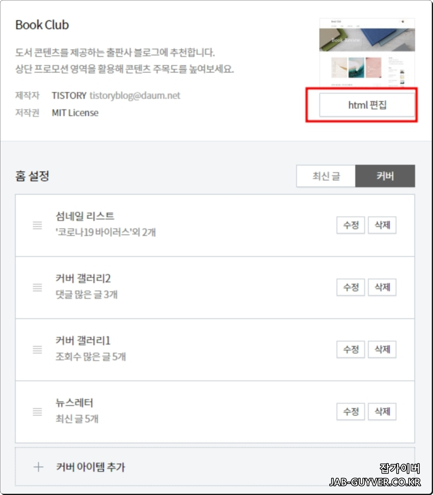 티스토리 설정 -> HTML로 들어갑니다.
