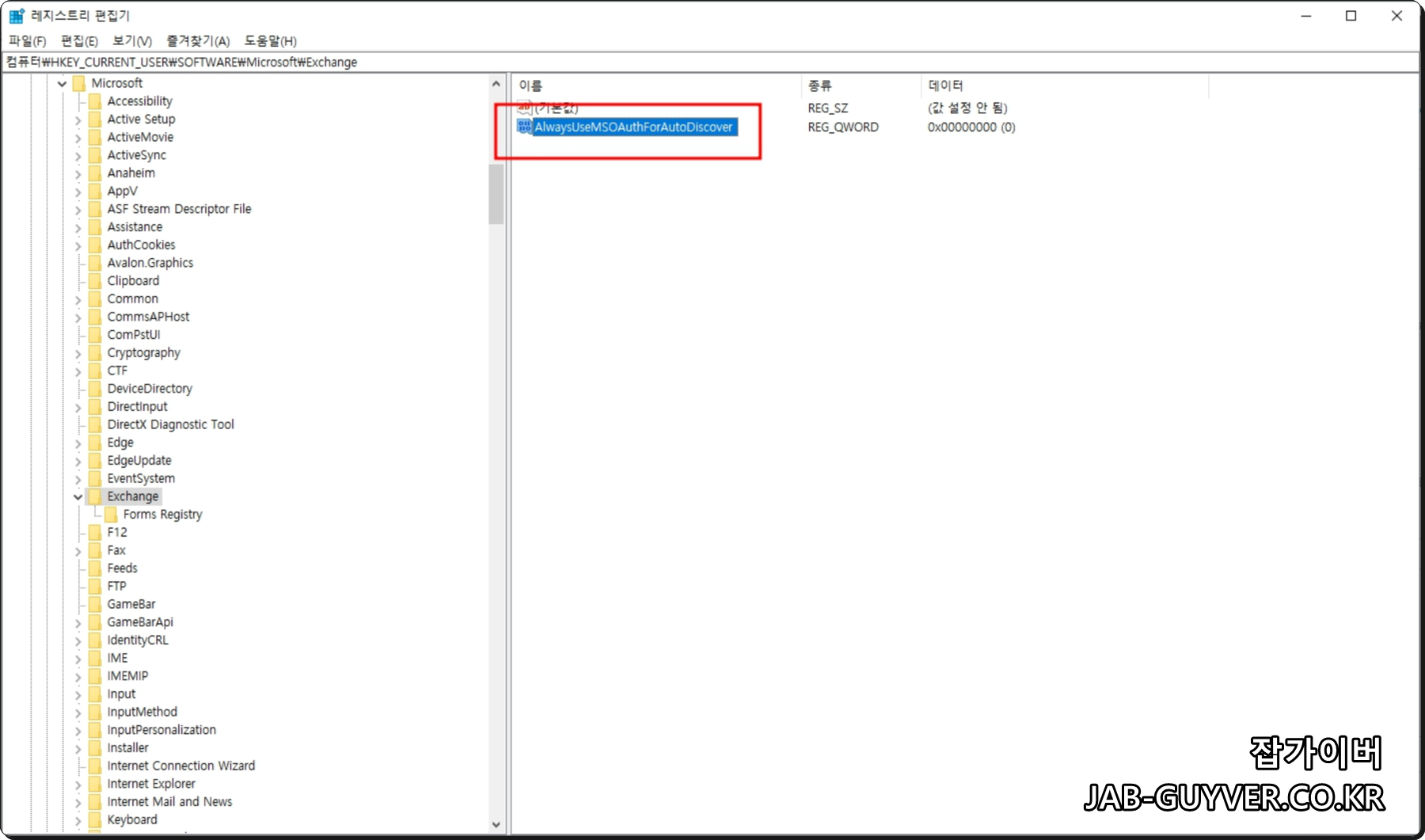 AlwaysUseMSOAuthForAutoDiscover 수정을 눌러 값 데이터를 1로 변경합니다.