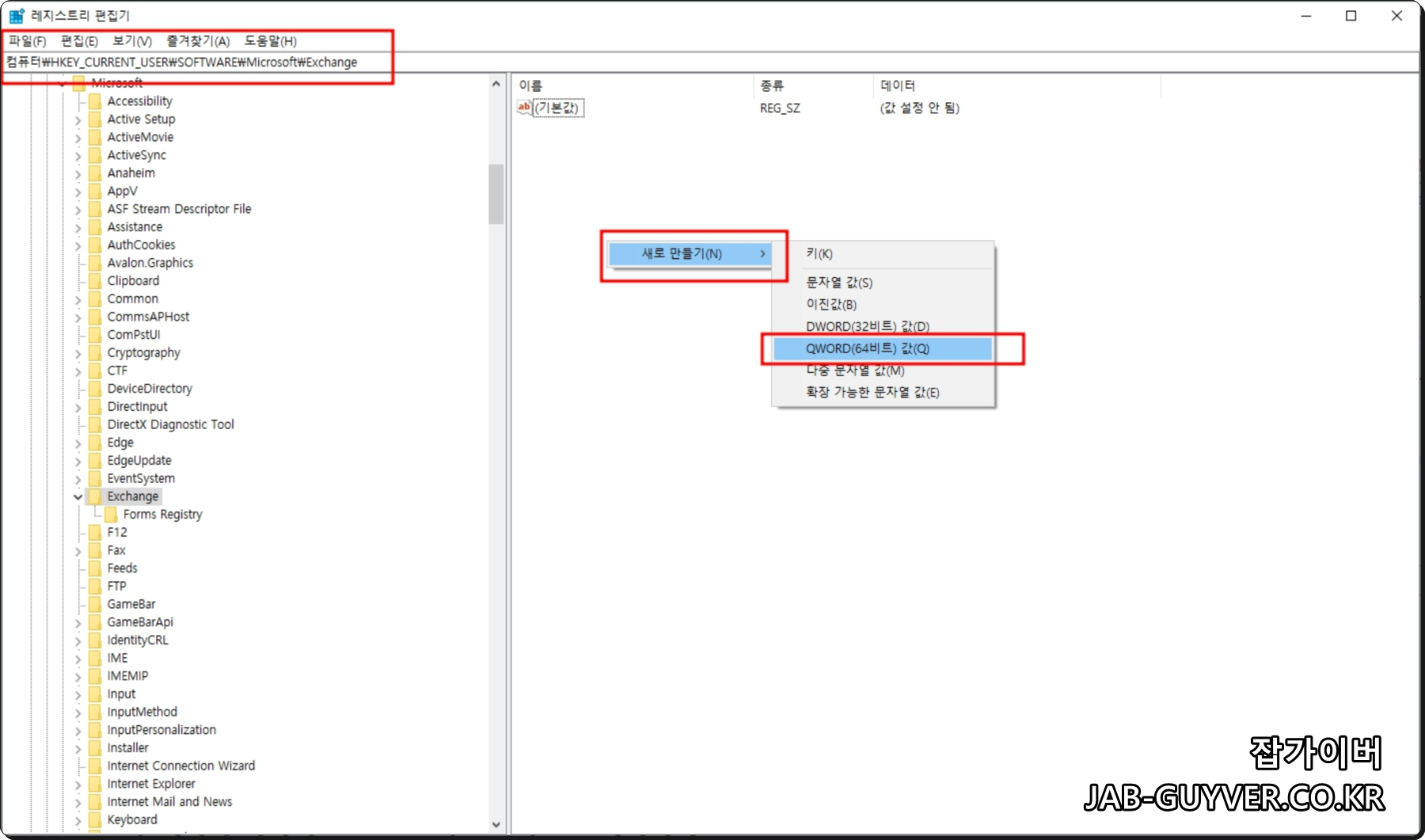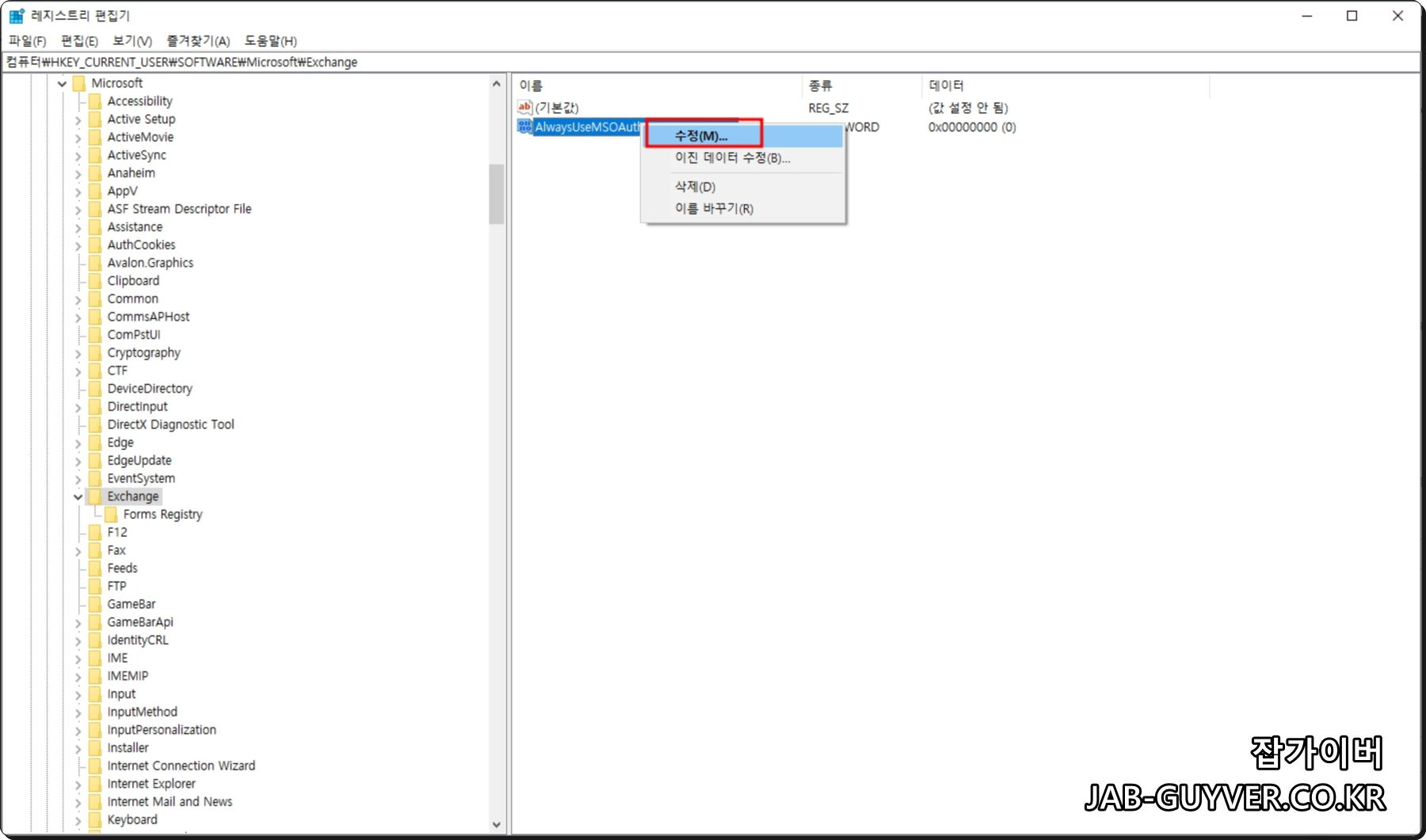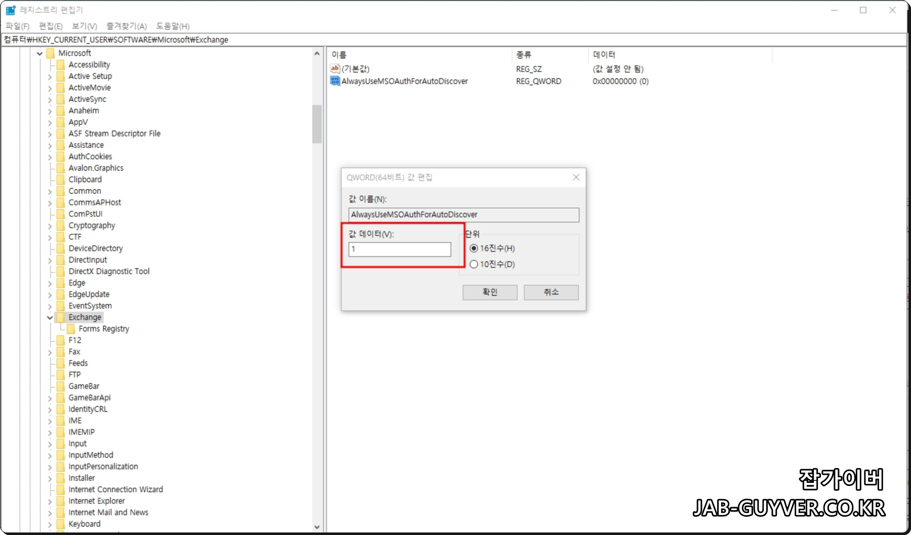 AlwaysUseMSOAuthForAutoDiscover 수정을 눌러 값 데이터를 1로 변경합니다.