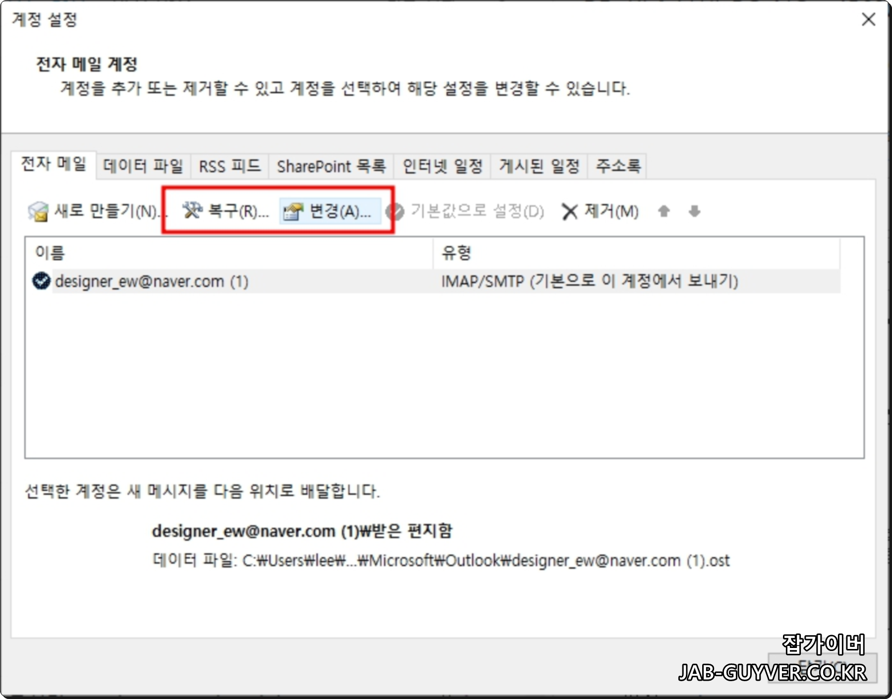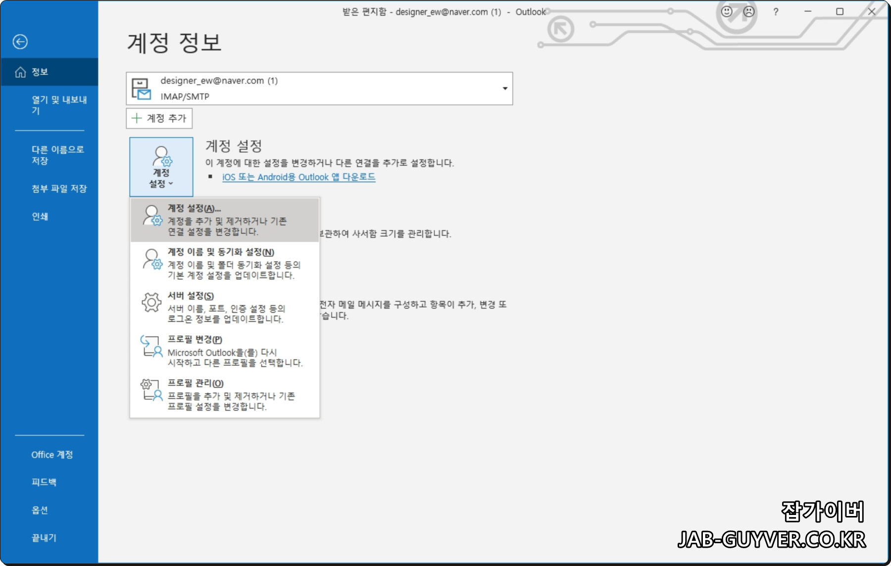 아웃룩 계정정보 -> 계정설정 -> 계정설정으로 들어갑니다