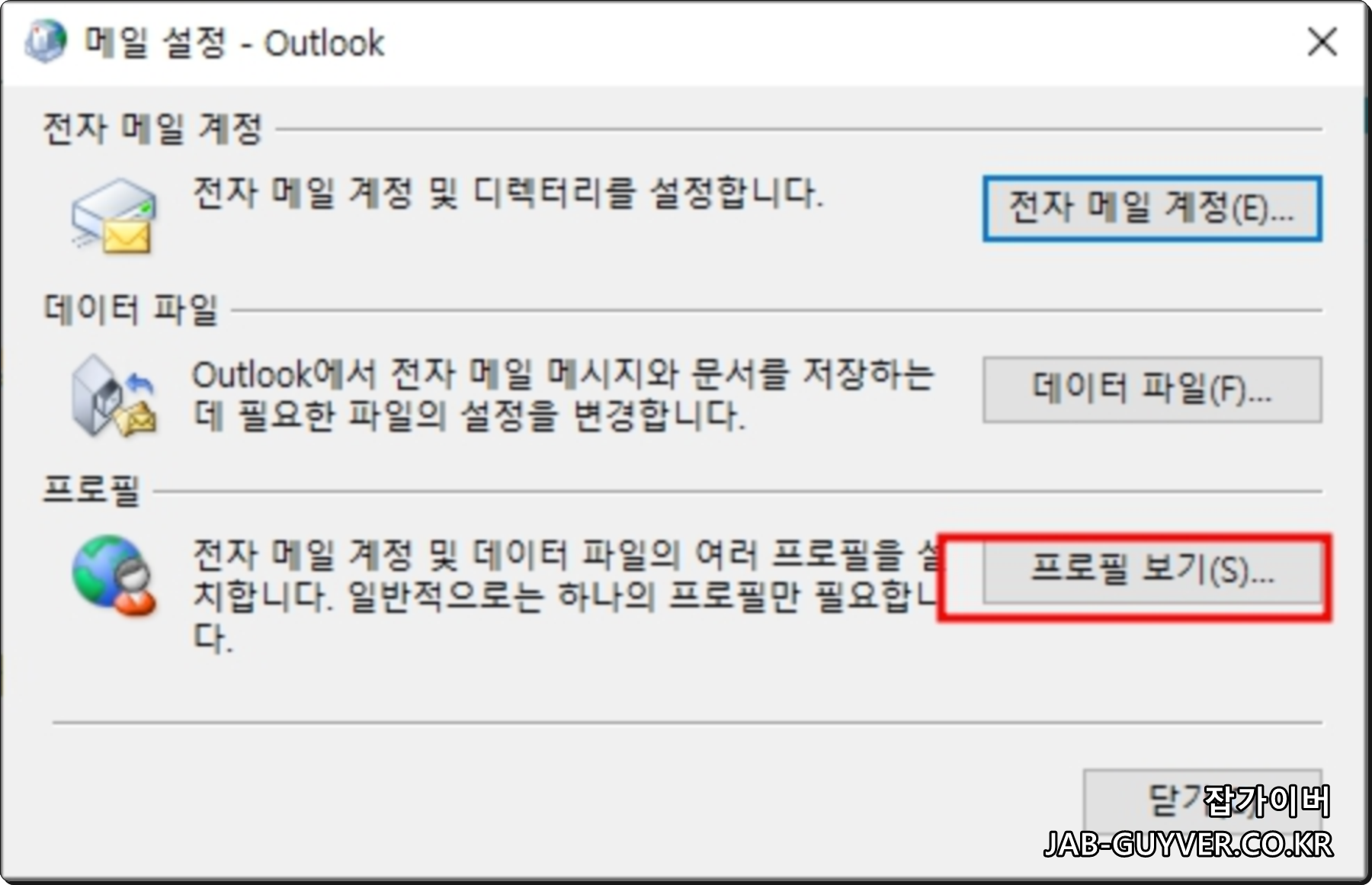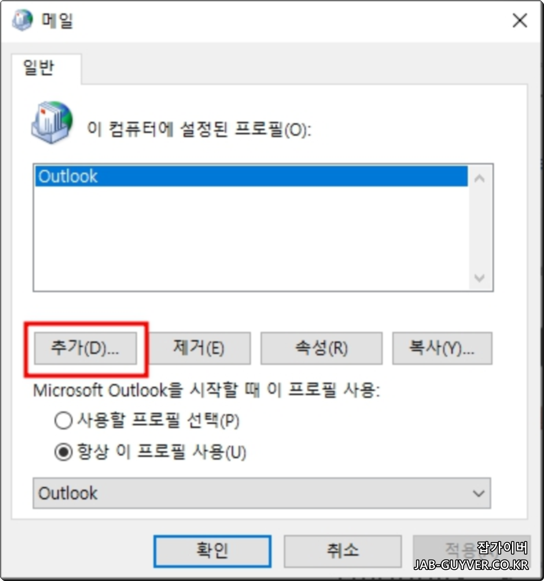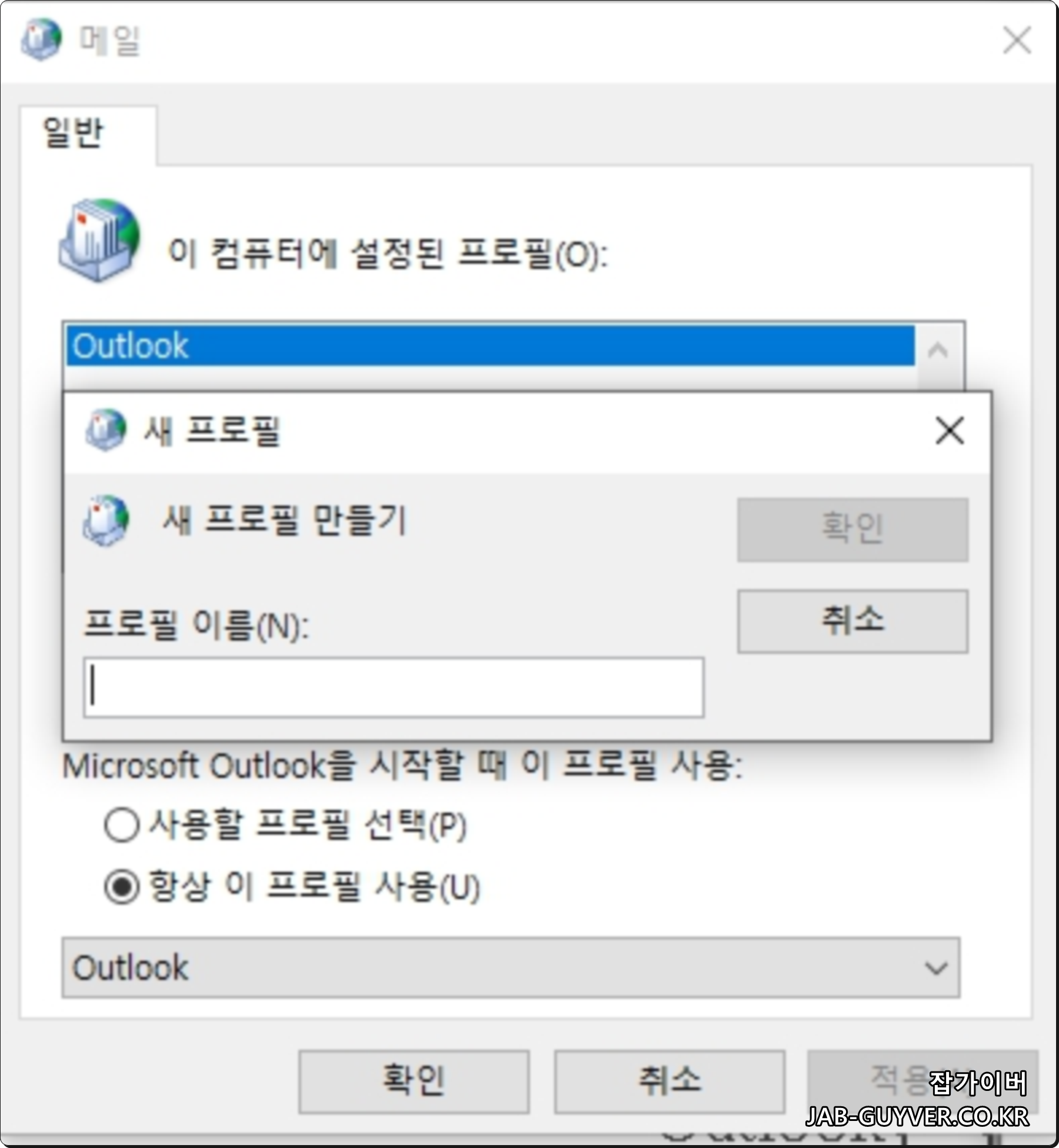 단, 기본 프로필 설정을 변경해줘야 합니다. 제어판 > 메일 > 프로필 보기에서 기본 사용 프로필을 새로 설정한 이름으로 바꿔주세요.