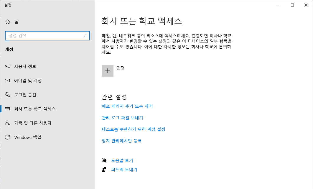 윈도우에서 회사 또는 학교 엑세스에서 메일이나 앱, 네트워크 동의 리소스등 계정이 연동되어 있다면 해당계정을 삭제합니다.