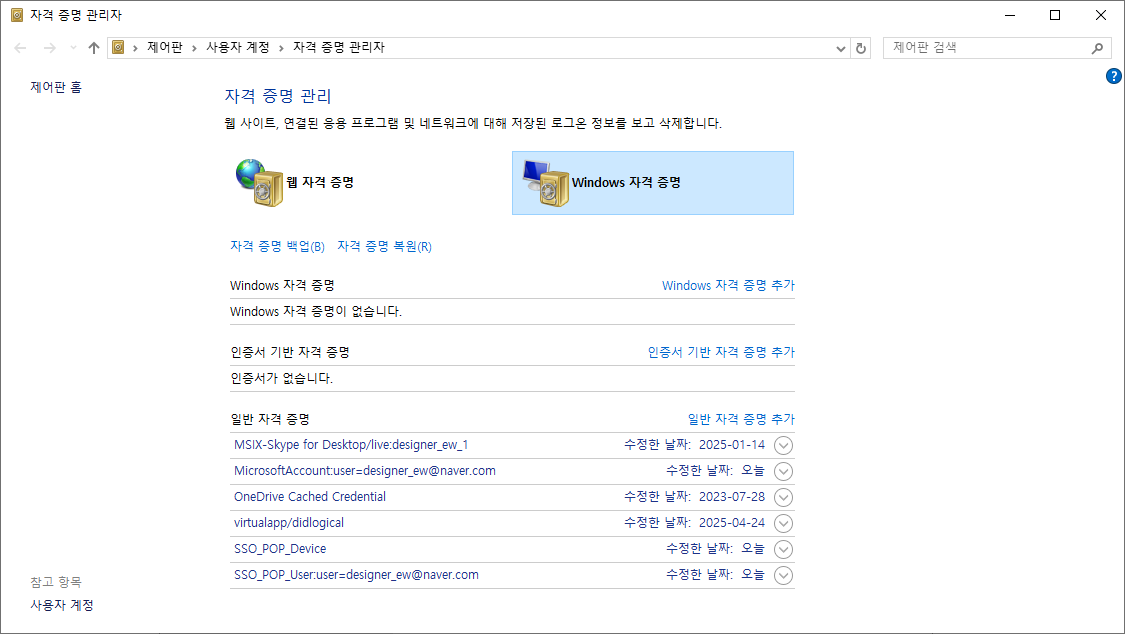 '자격 증명 관리자'에서 저장된 이메일 관련 자격 정보를 모두 삭제한 후 다시 로그인해보세요.
