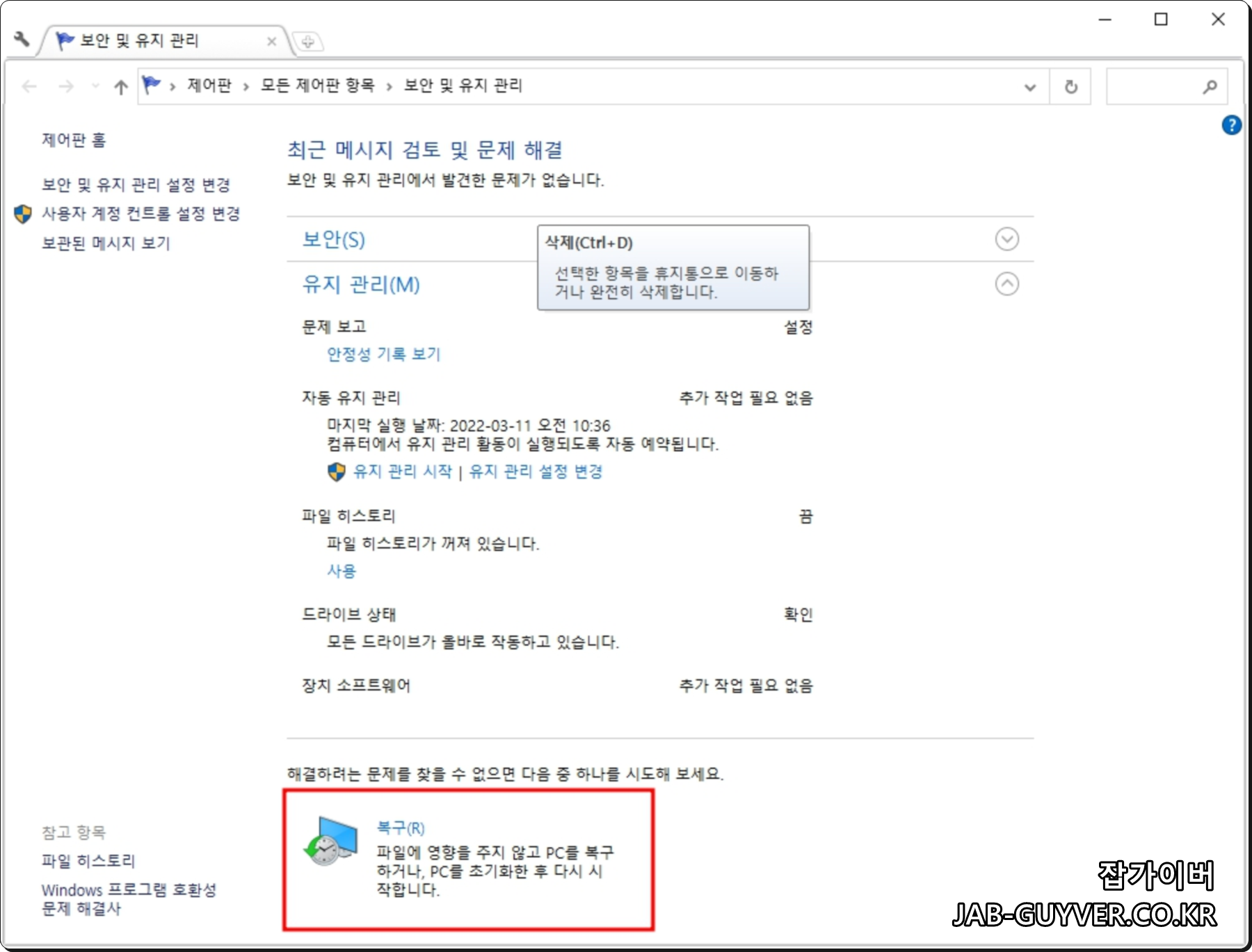 이후에도 문제가 반복된다면 정상적으로 작동하던 윈도우 시점으로 복구지점을 찾아 복원합니다.