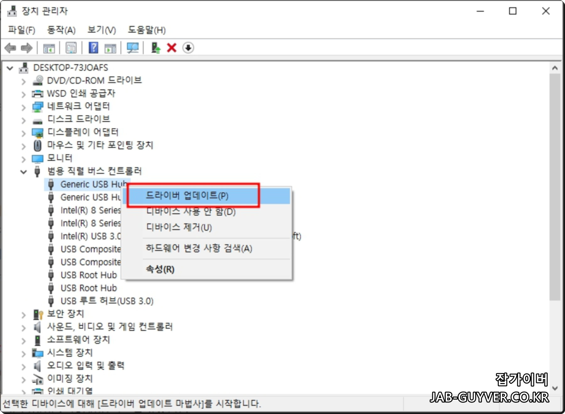 - 사용중인 컴퓨터의 윈도우 USB 드라이버를 업데이트 합니다.