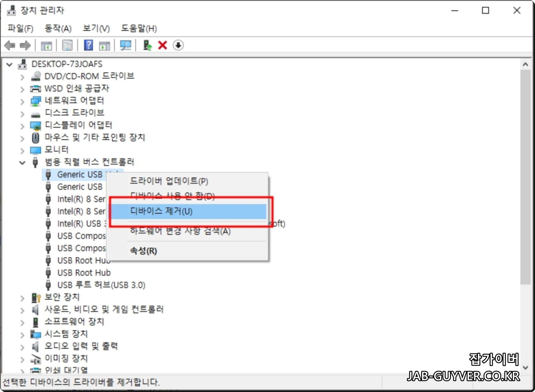 - 드라이버 설치 후 디바이스가 제대로 작동하지 않는다면 해당 USB 컨트롤러를 비활성화 후 재설치 합니다.