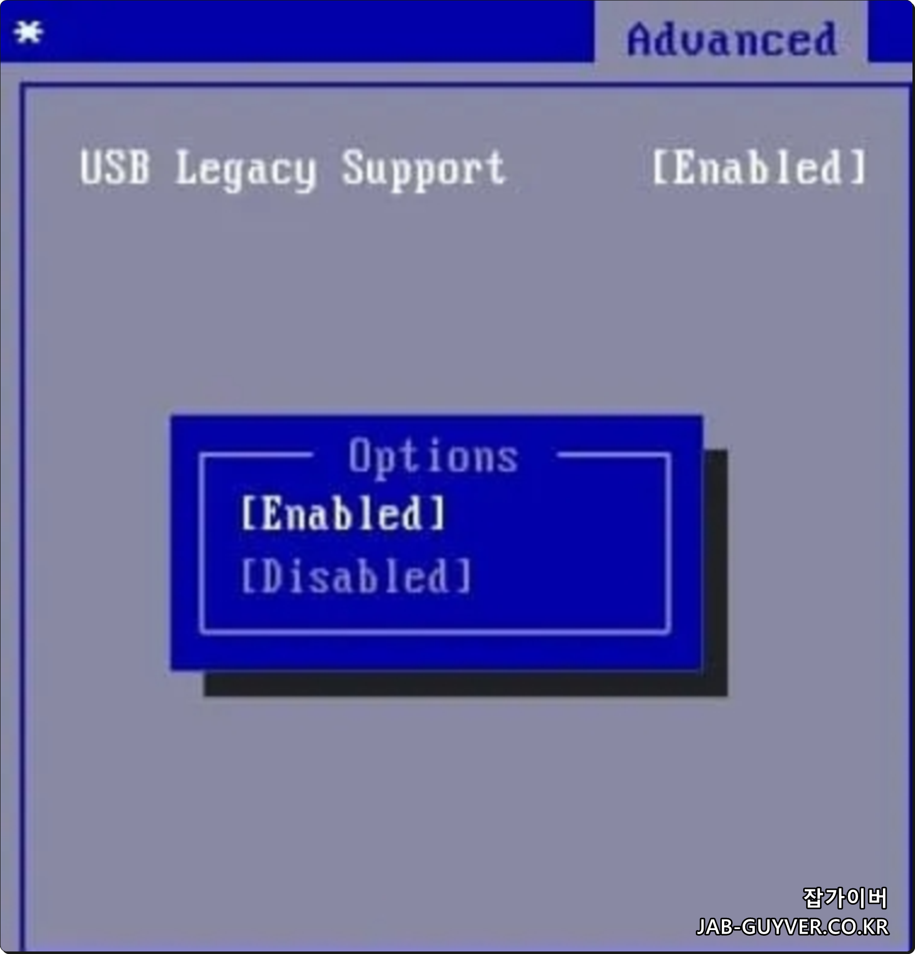 - 고급 -> USB레거시 지원 "USB Legacy Support"를 비활성화에서 활성화로 변경합니다.