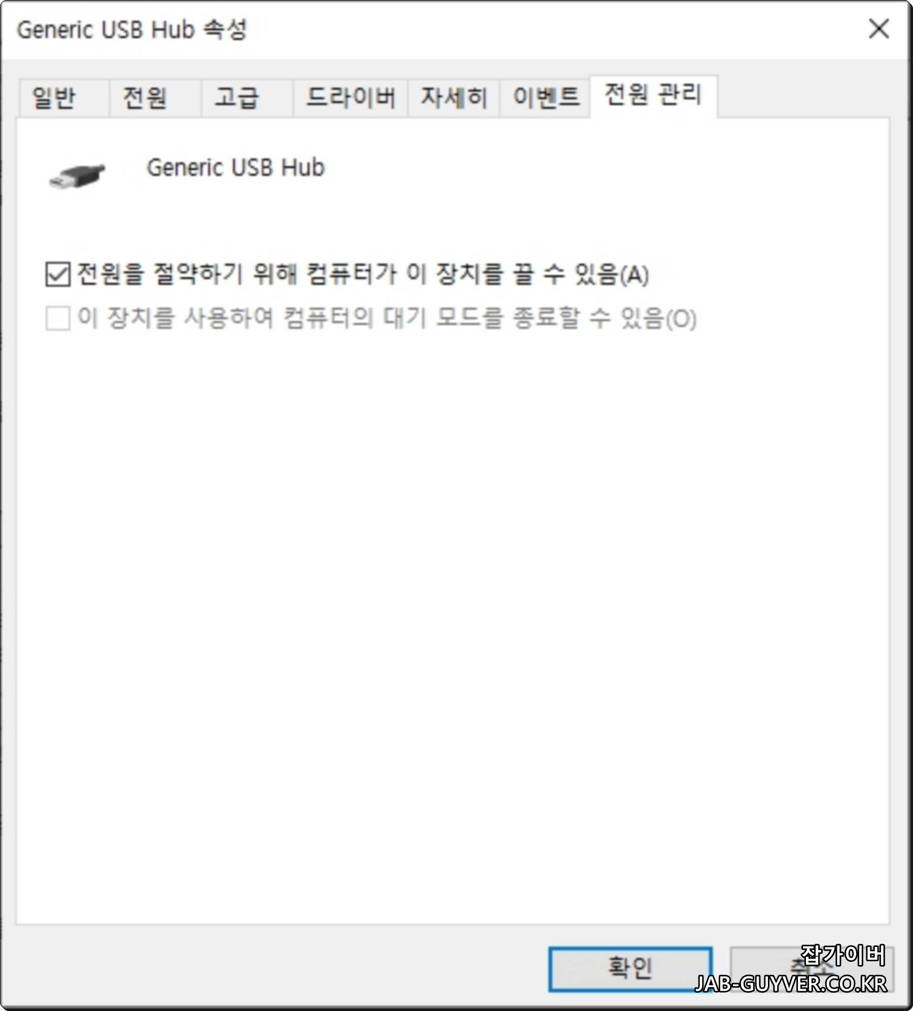 - USB 허브 설정에서 전력 설정에서 Allow the computer to turn off this device to save power. Finally, save your settings.체크해제합니다.