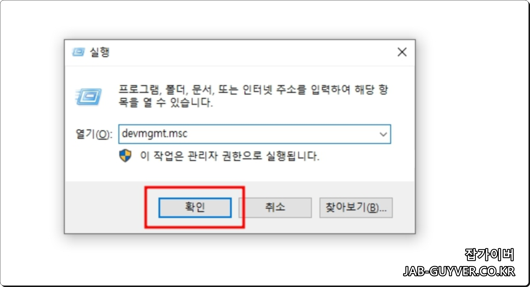 - 윈도우키 + R을 눌러 실행창 -> devmgmt.msc 입력 후 엔터를 눌러줍니다.