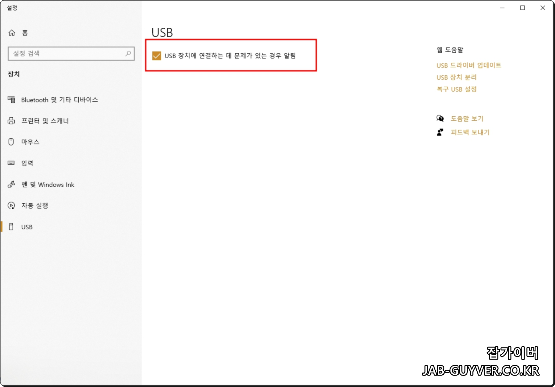 USB설정을 통해 USB 연결 시 문제가 발생 시 알림이 표시되도록 설정합니다.