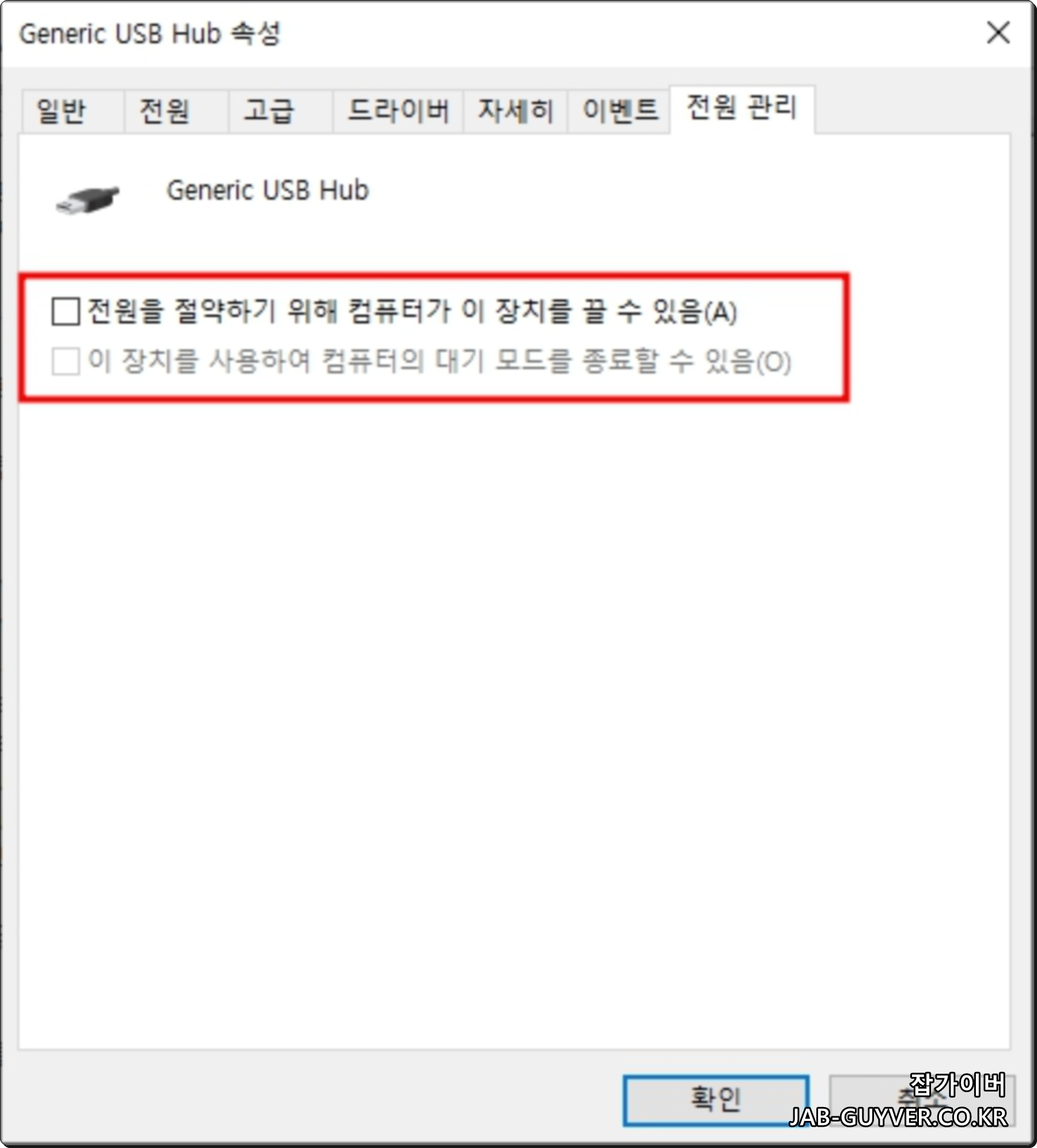 - USB 허브 설정에서 전력 설정에서 Allow the computer to turn off this device to save power. Finally, save your settings.체크해제합니다.