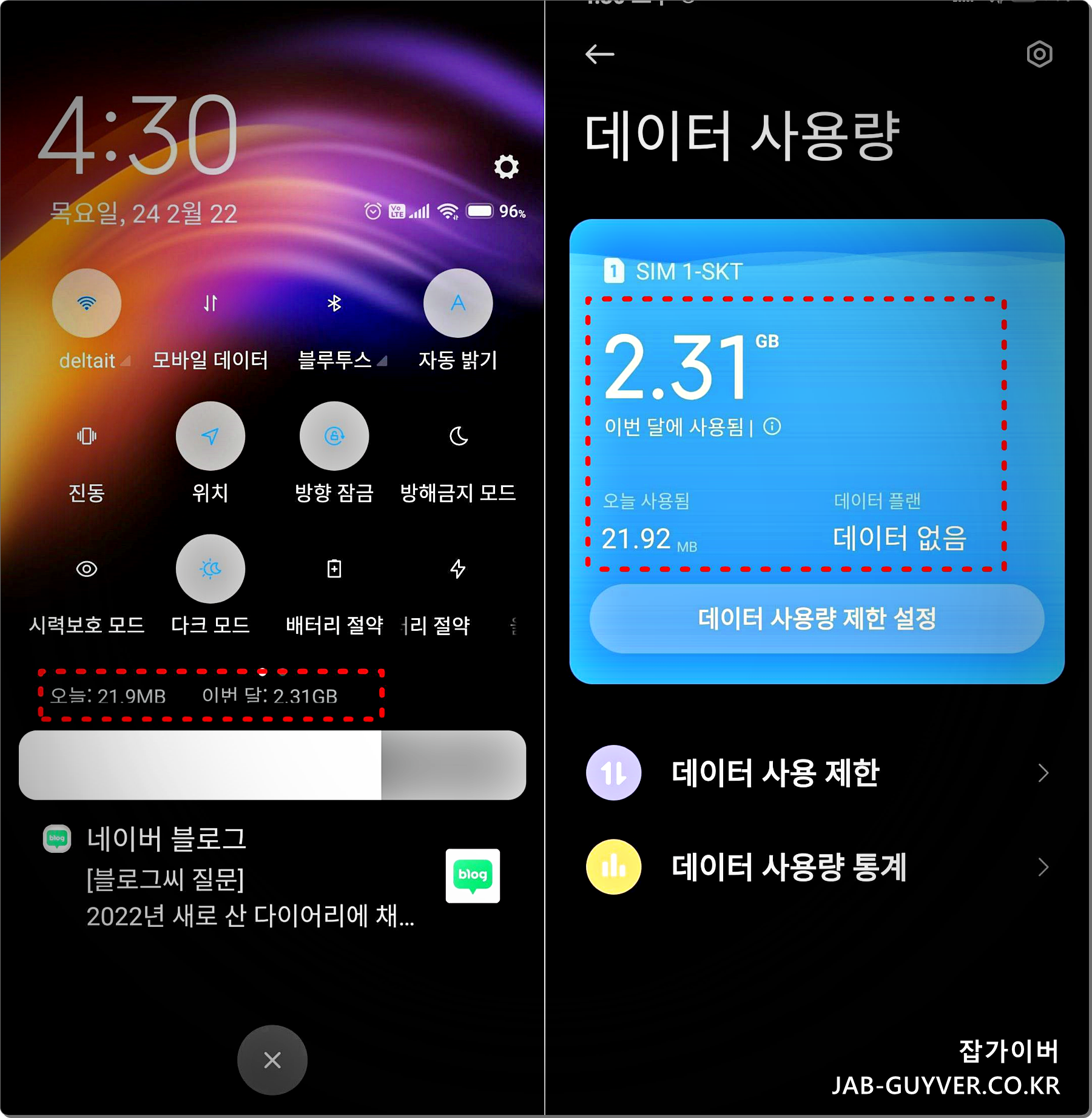 월간 데이터 사용량 설정해 해당 용량 이상 인터넷 사용 시 알림이 울리도록 설정합니다.