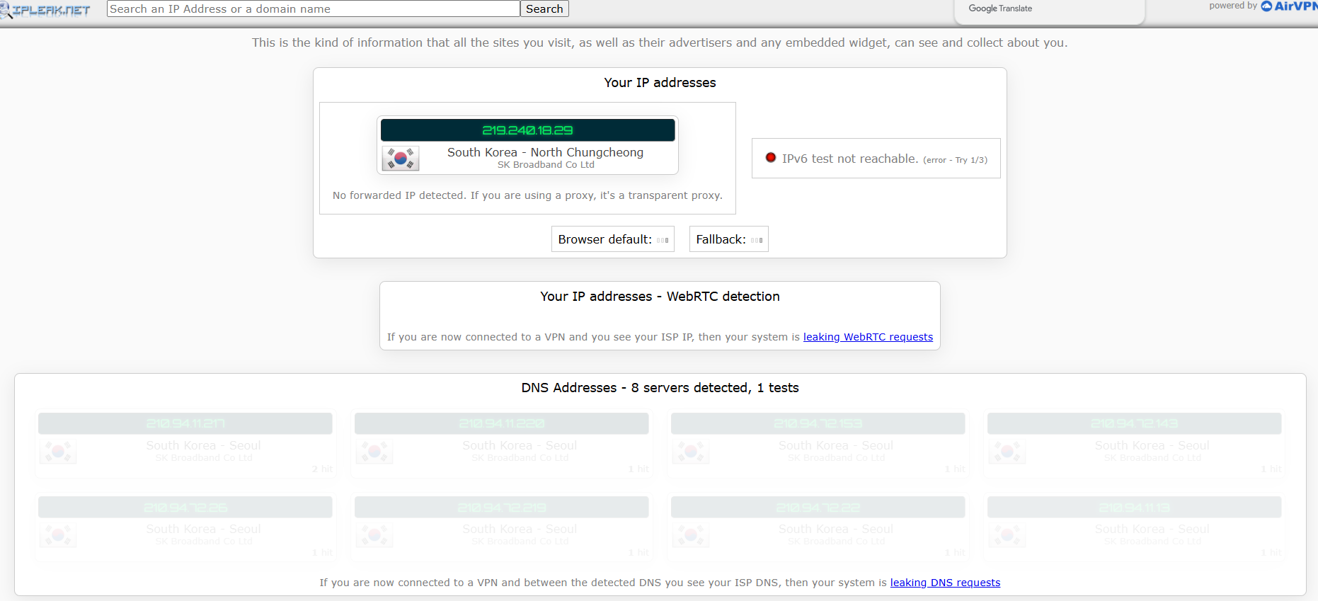 자신이 사용하는 VPN 프로그램을 실행 후 IPLEAK.NET 사이트로 접속합니다.