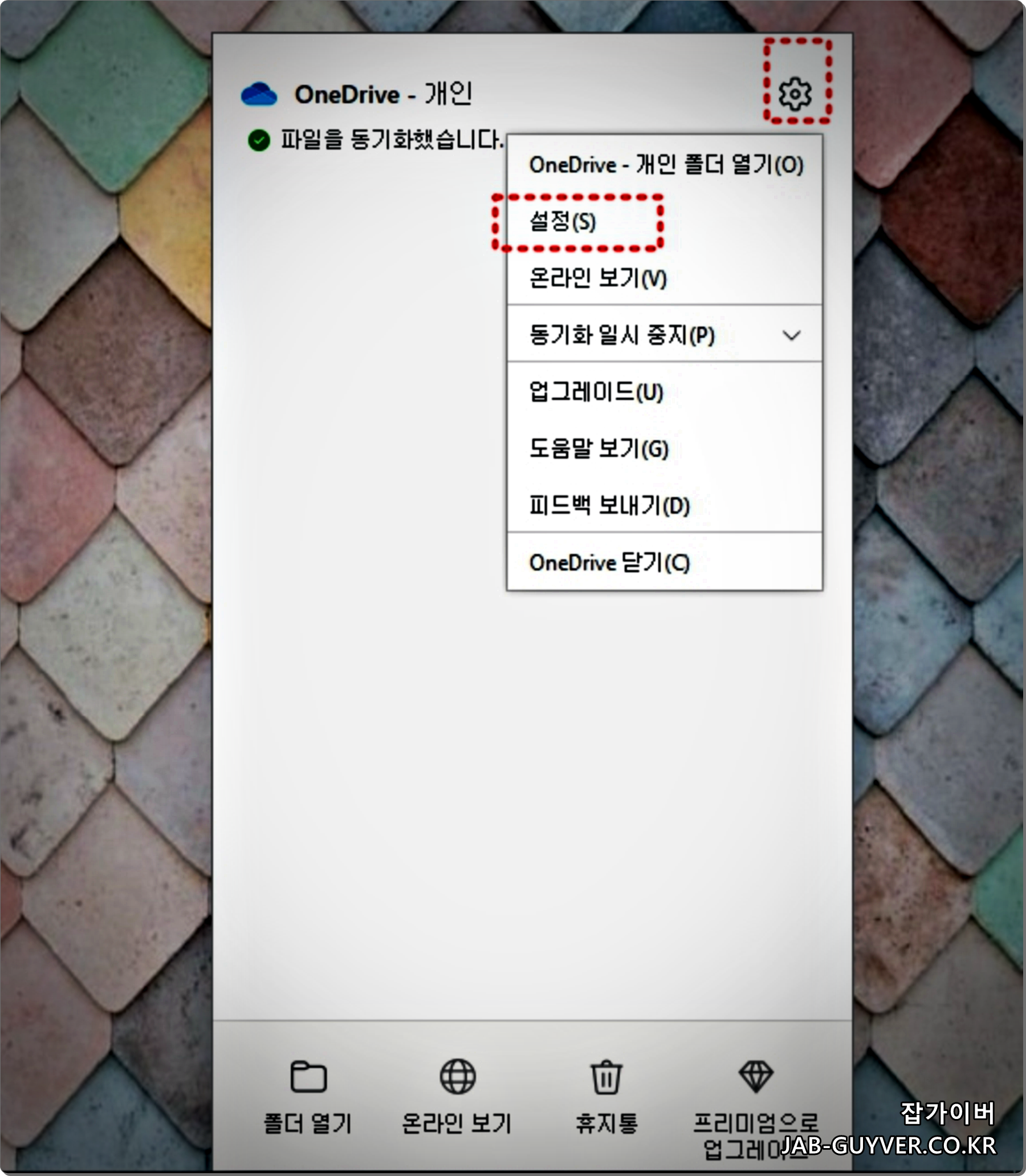 우측하단 윈도우 작업표시줄 원드라이브를 선택 후 설정으로 들어갑니다.