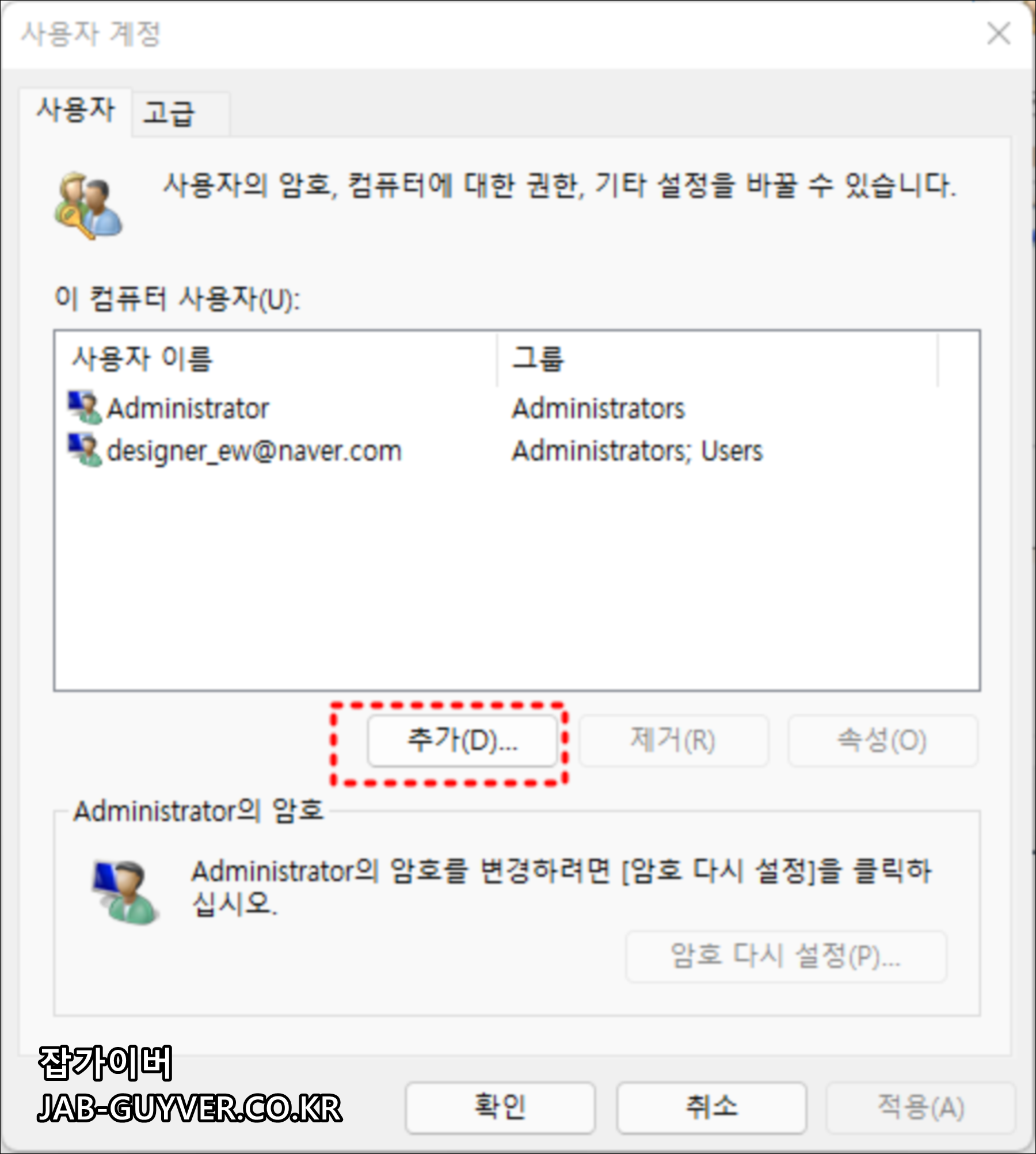 - 사용자 계정 창이 나타나면 추가 버튼을 클릭합니다.