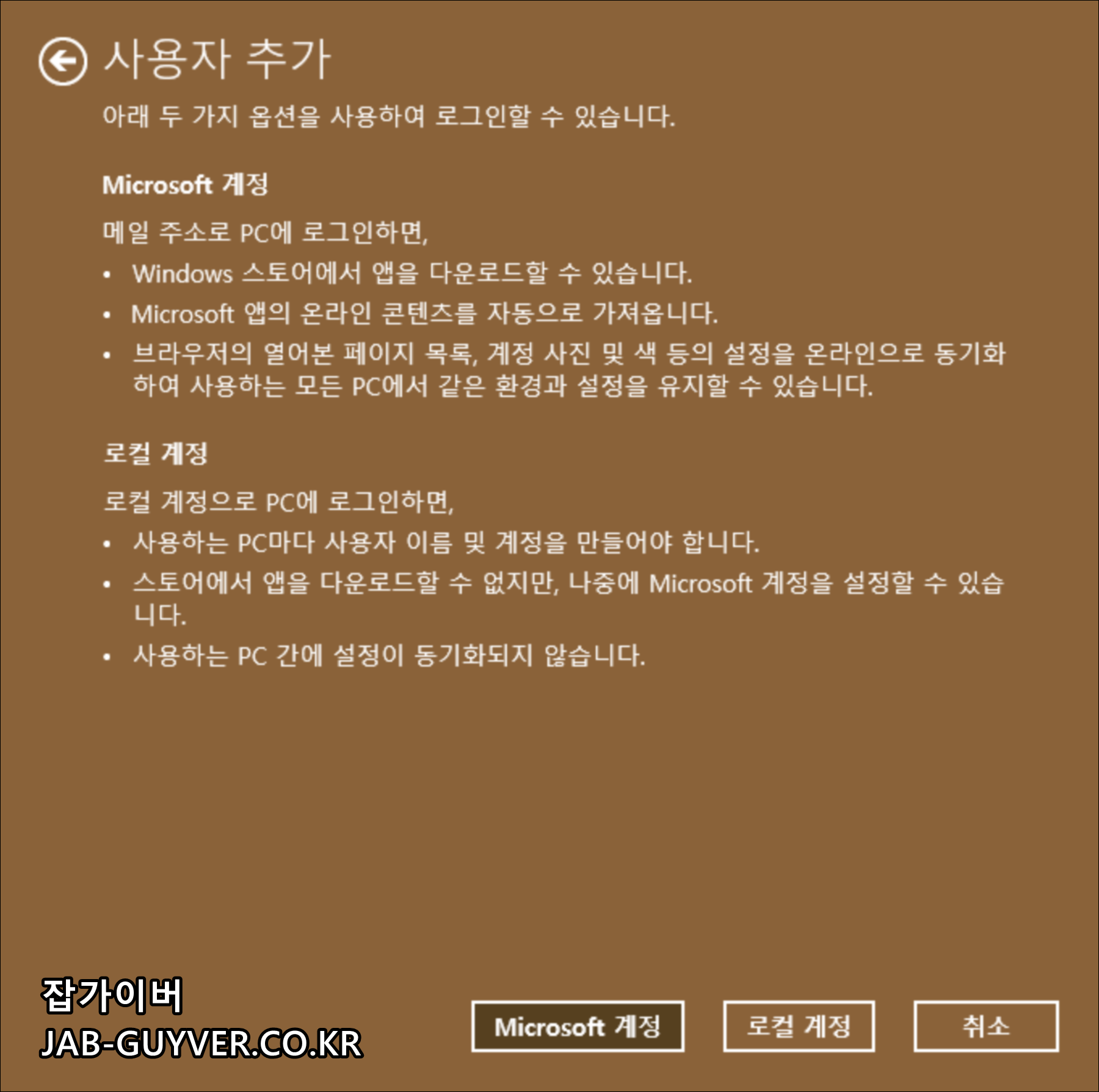 - 로컬 계정을 추가하려면 하단의 'Microsoft 계정없이 로그인(권장하지 않음)' 을 클릭하고 이 후 로컬 계정 버튼을 클릭하여 계정 생성을 진행합니다.