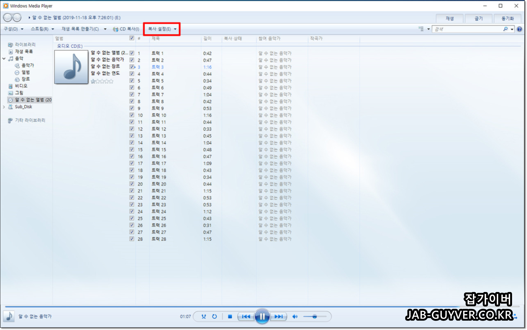 음악CD 윈도우미디어플레이어 재생목록 추가