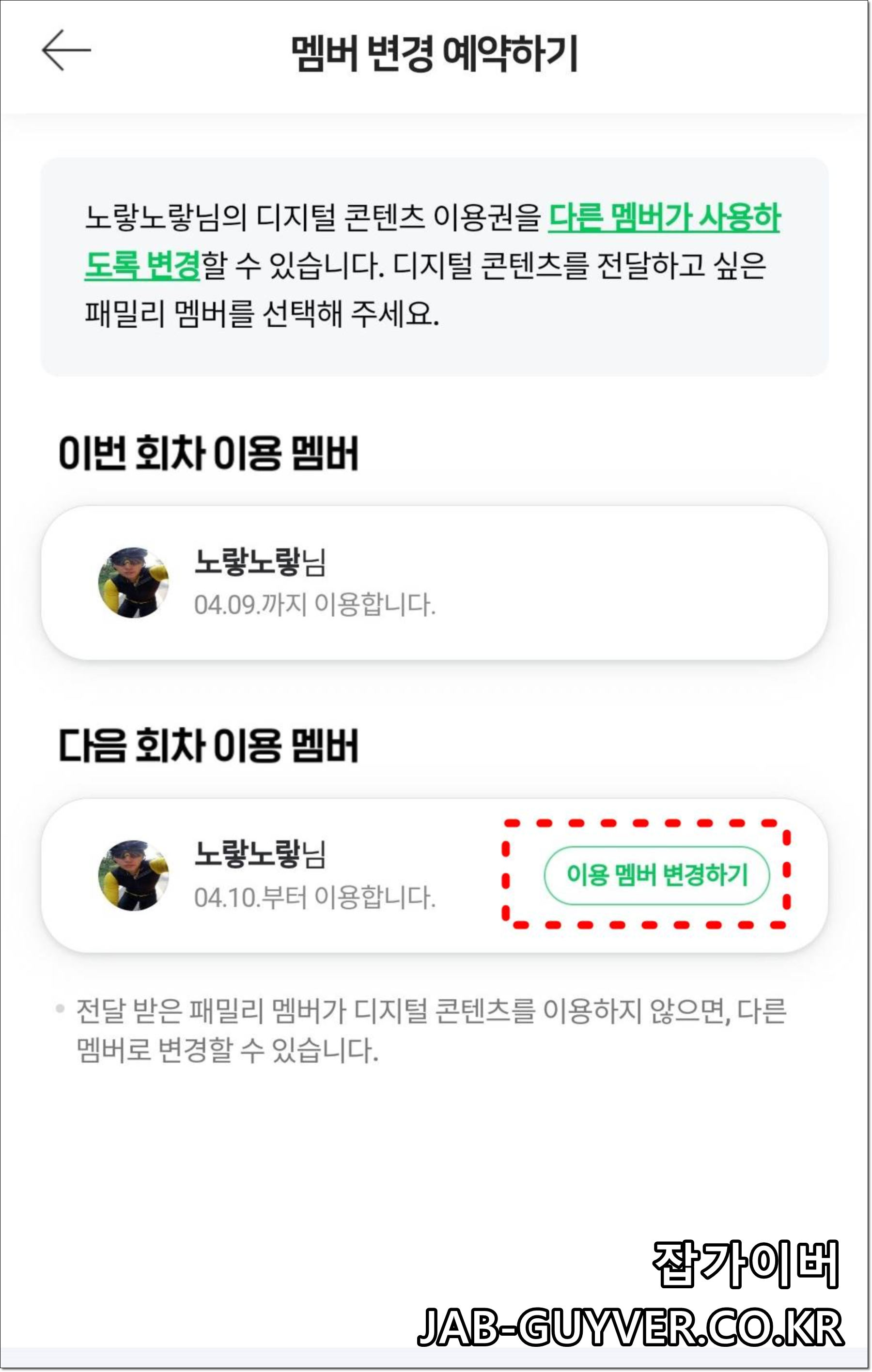 현재 사용하고 있는 네이버멤버십 플러스의 이용멤버도 다른 사용자로부터 변경할 수 있습니다.