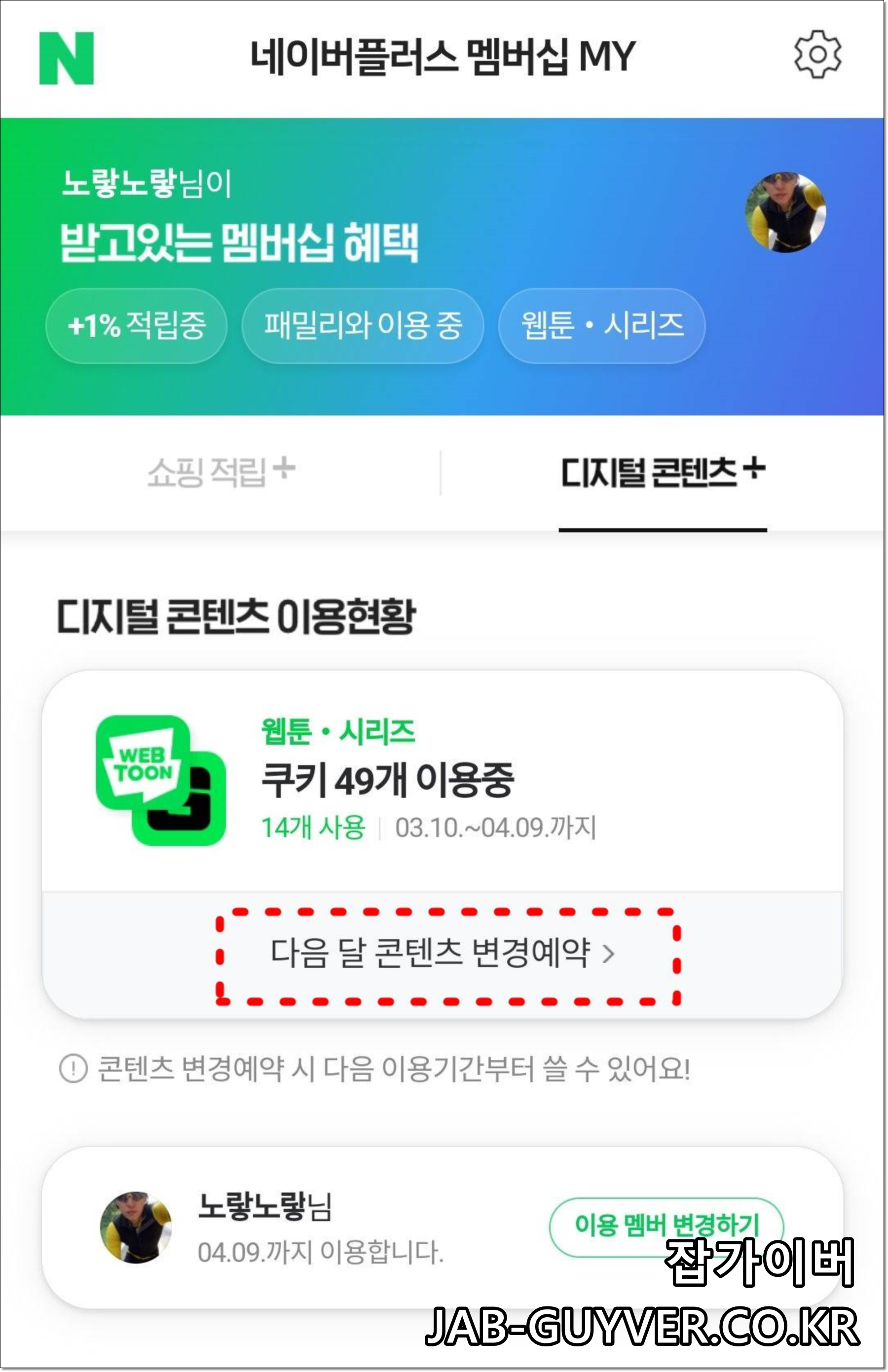 현재 네이버 시리즈 쿠키 49개를 사용중에 있으며 다음달 콘텐츠 변경예약을 통해 6가지중에서 변경할 수 있습니다.