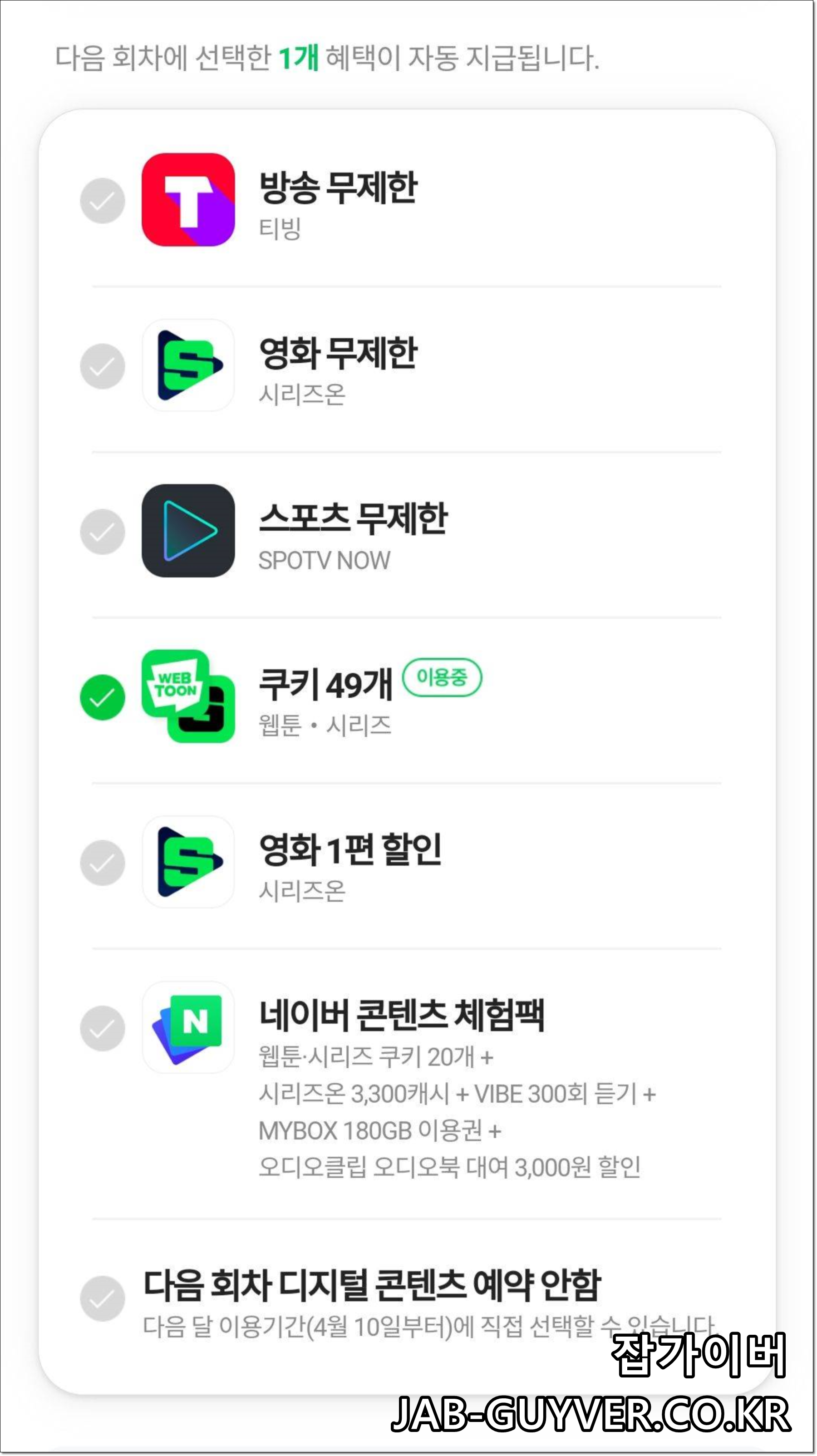 네이버 N결제 적립인 네이버플러스멤버십을 사용하고 있다면 매달 네이버 웹툰 쿠키 49개 및 티빙 영화 드라마 스포츠등을 원하는 컨텐츠를 선택해 무료로 시청할 수 있으며 이는 매달 새로운 혜택을 선택해서 변경신청 할 수 있습니다.