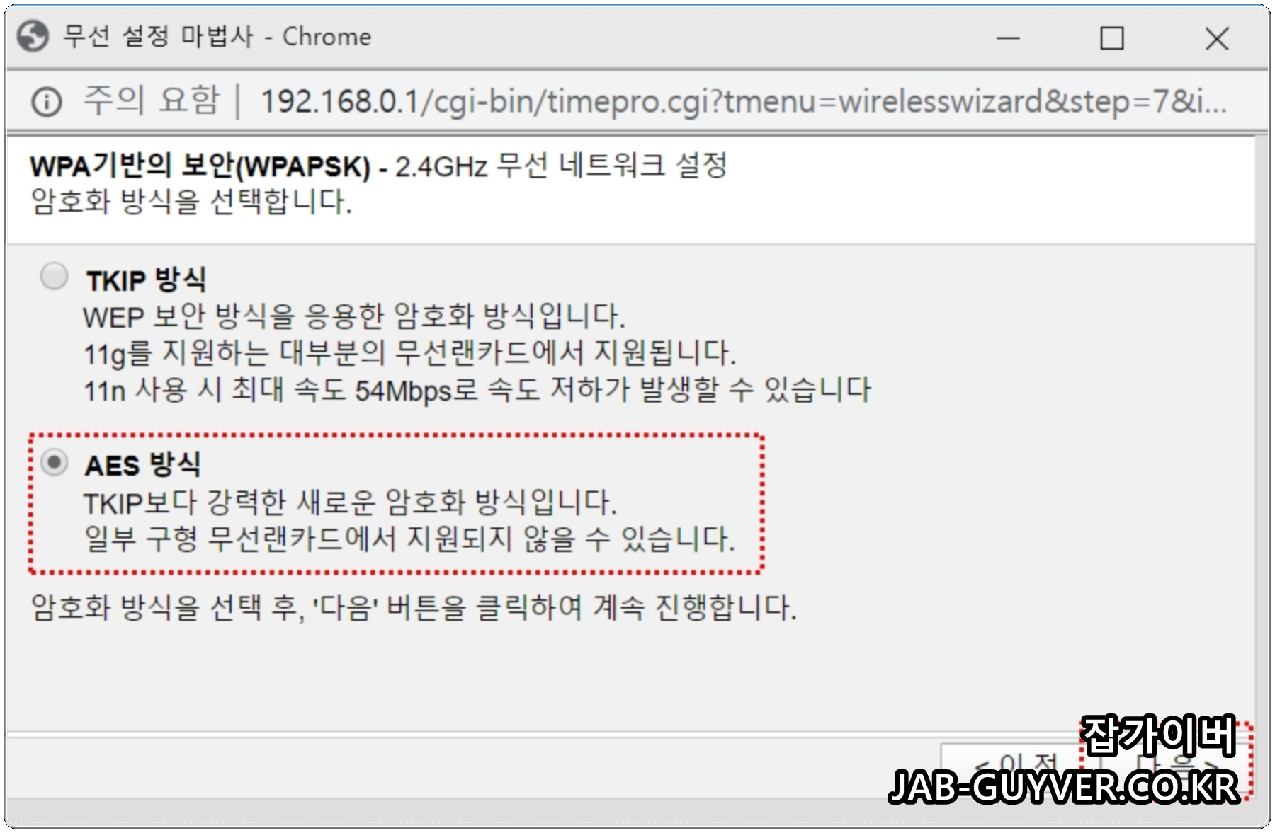 | AES 방식 | TKIP 보다 강력한 암호방식으로서 일부 구형 무선 랜카드에서 지원하지 않을 수 있습니다. |