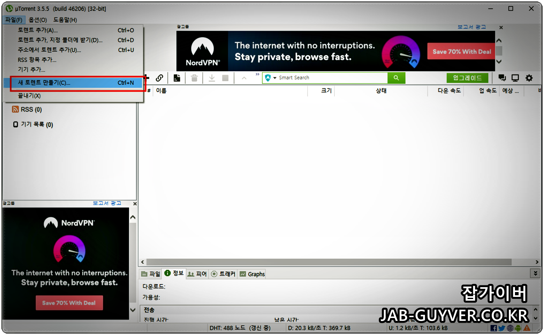 토렌트 실행되었다면 파일 -> 새 토렌트 만들기를 선택합니다.