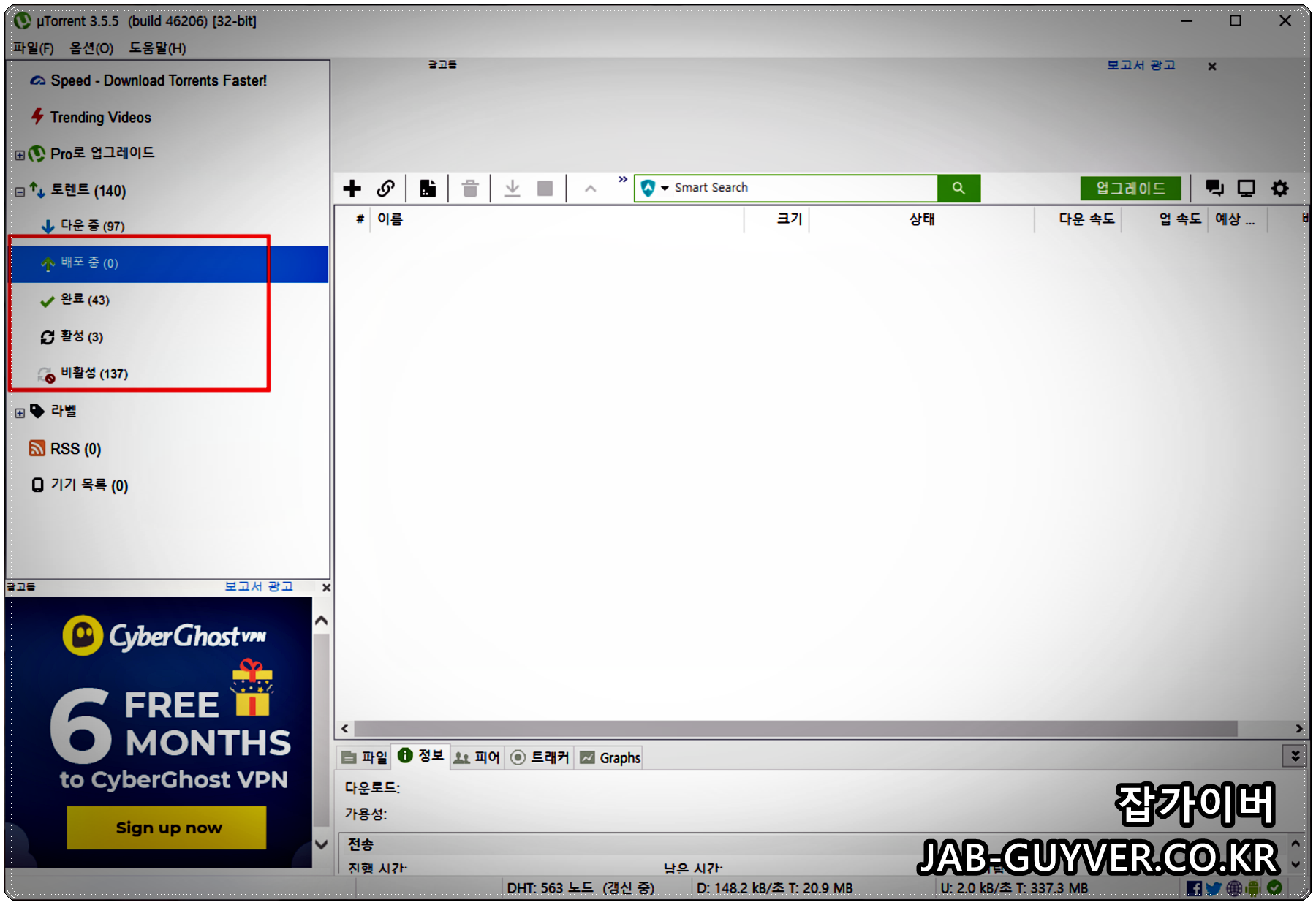 이렇게 만들어진 토렌트파일은 공유중인 경우 배포상태 및 완료된 상태등을 탭에서 확인할 수 있습니다.