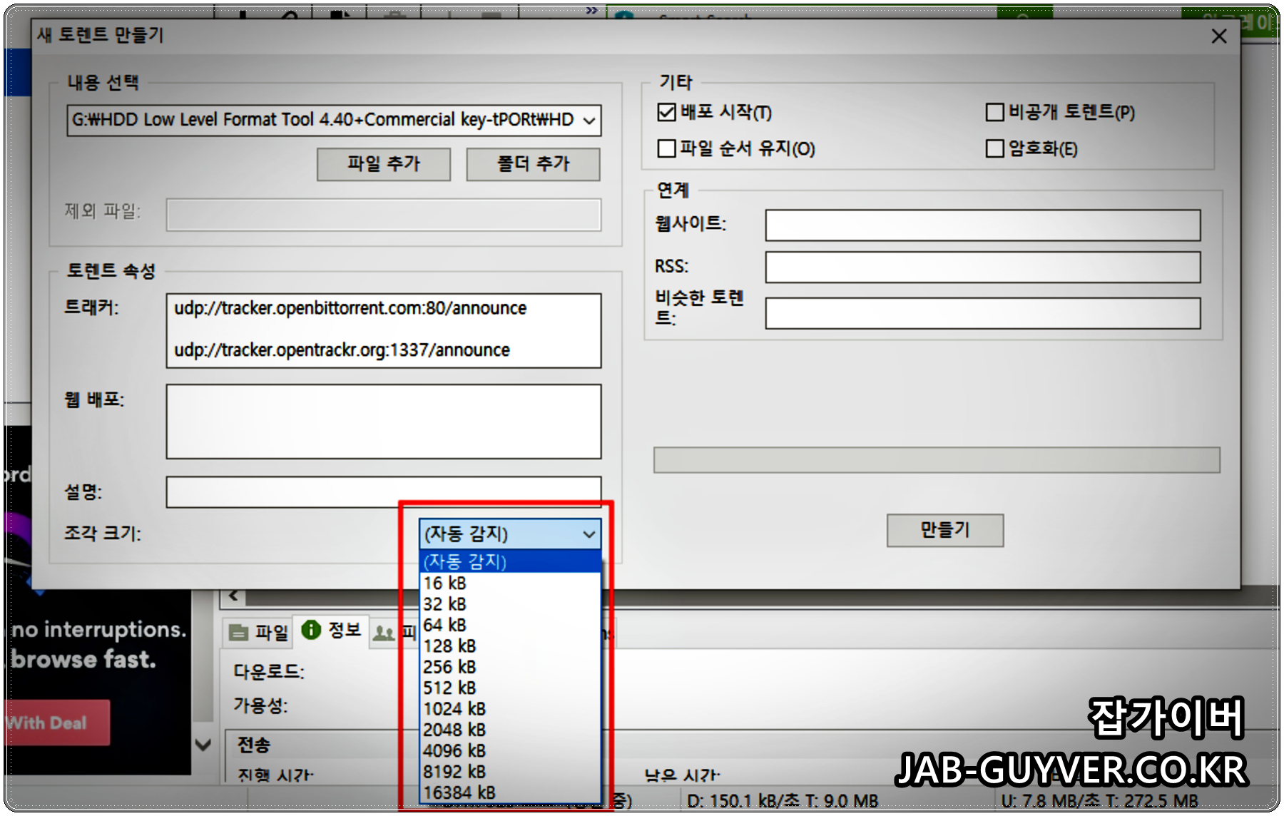 토렌트 파일공유 시 조각크기를 자동감지 및 16kb ~ 16384kb 사이로 지정할수 있습니다.