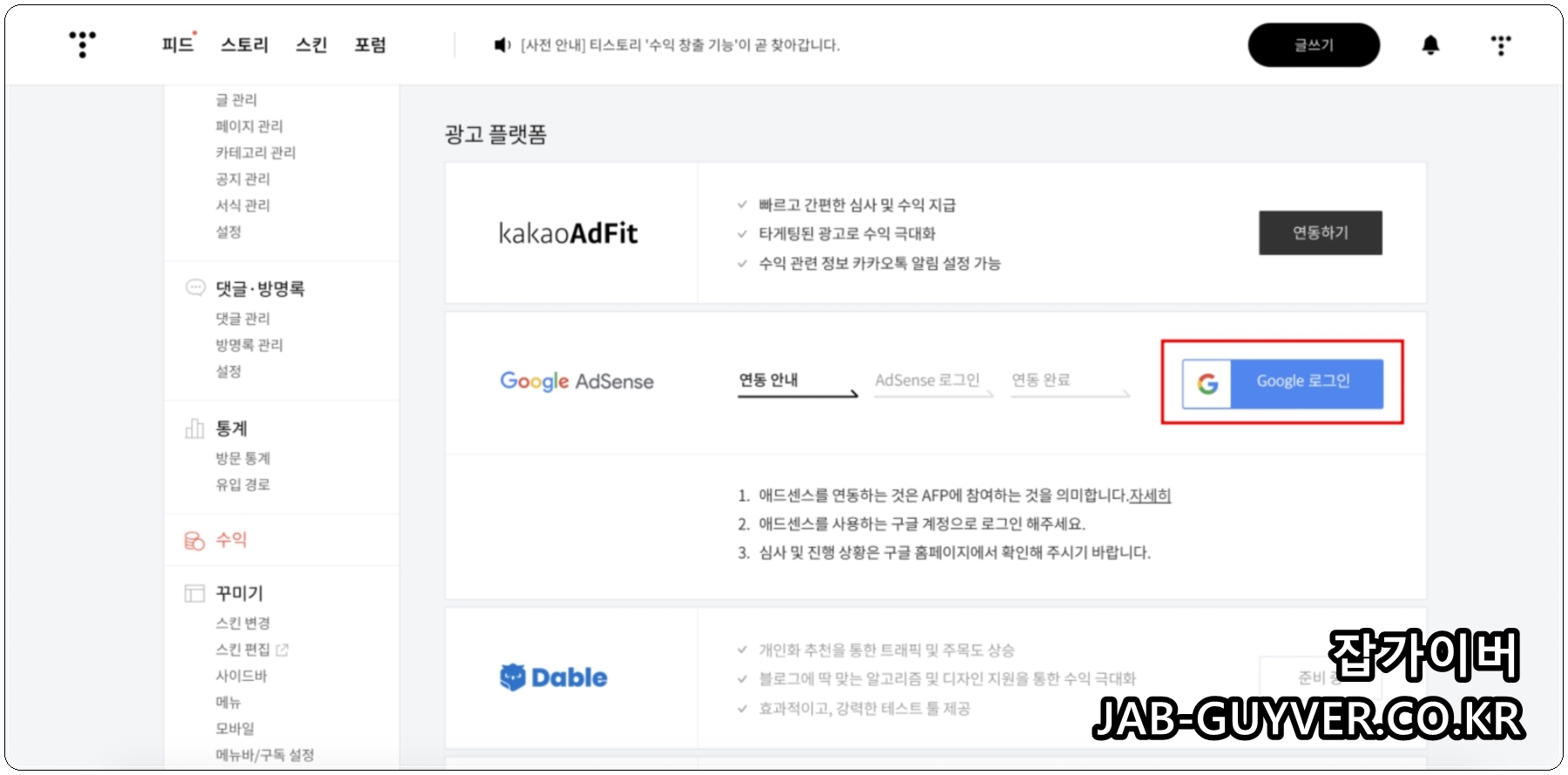좌측 애드센스 -> 애드센스 연동하기를 선택하느것으로 티스토리 애드센스 신청을 진행합니다.