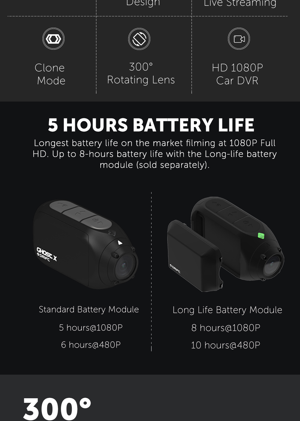 - 5시간 배터리 수명(풀 HD 1080P에서 녹화)입니다.