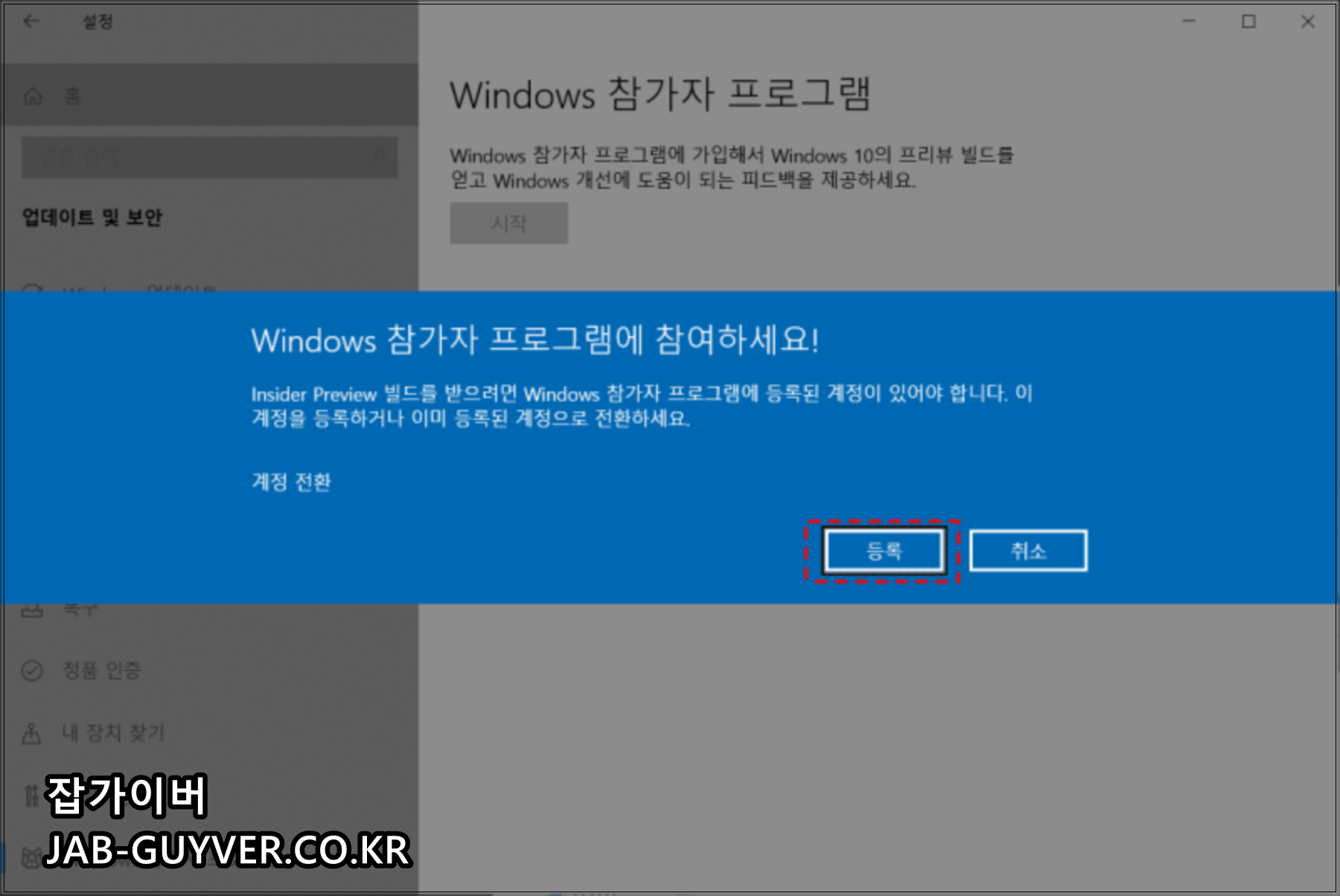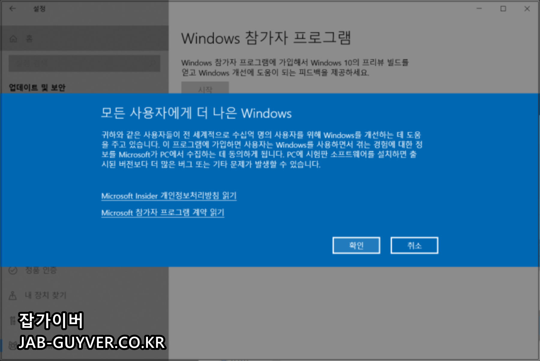 다음 Winodws 참가자 프로그램에 참여하여 윈도우11 업그레이드 설치를 진행합니다.