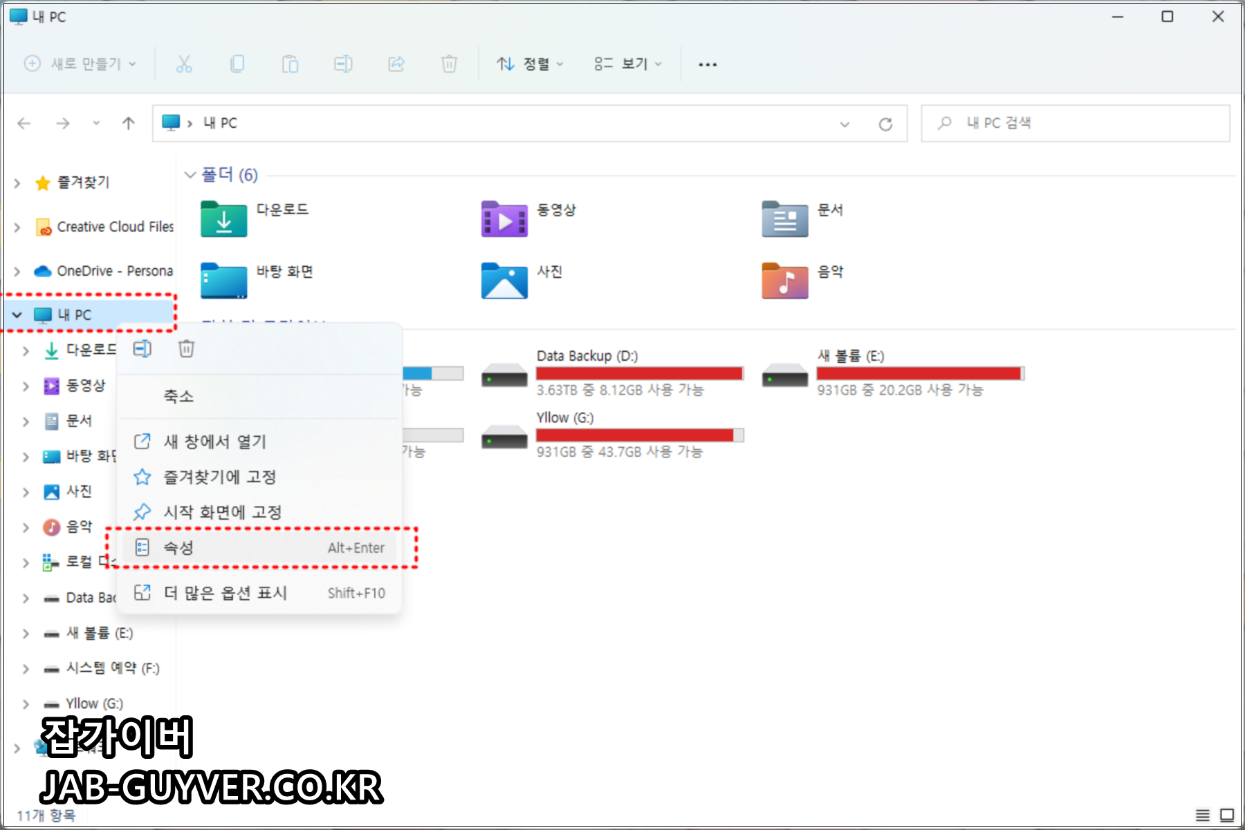 내PC -> 우클릭 속성으로 들어가거나 단축키 Alt + Enter를 눌러줍니다.