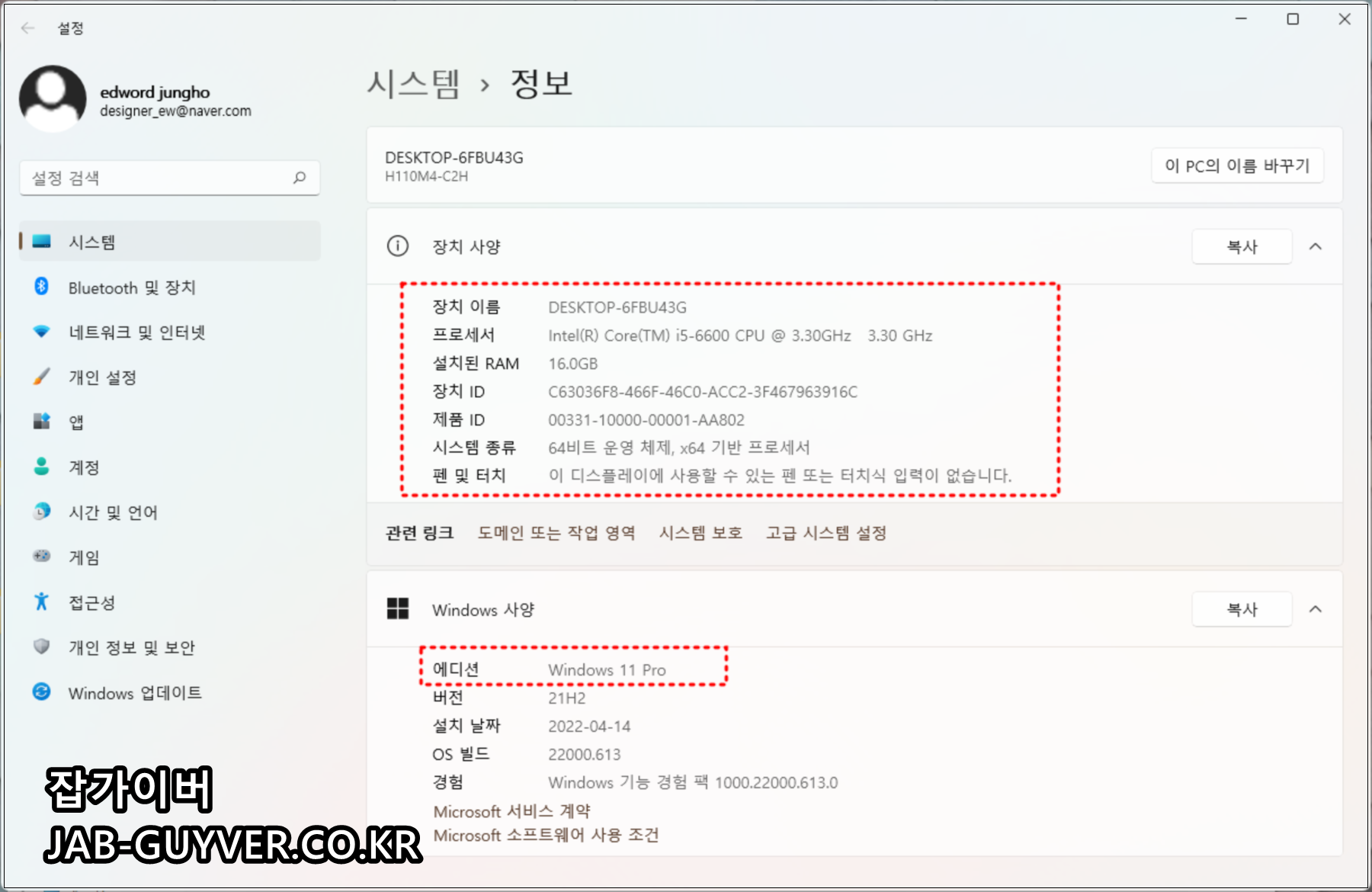 현재 저의 경우 윈도우11 Pro 21H2 버전으로 22000613 빌드버전입니다.
