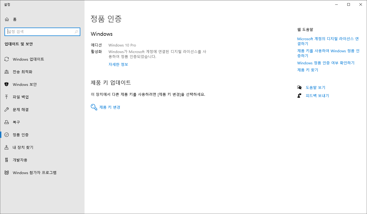 디지털 라이센스는 마이크로소프트 계정과 연결된 인증 방식으로, 제품키 없이도 자동 인증됩니다.
