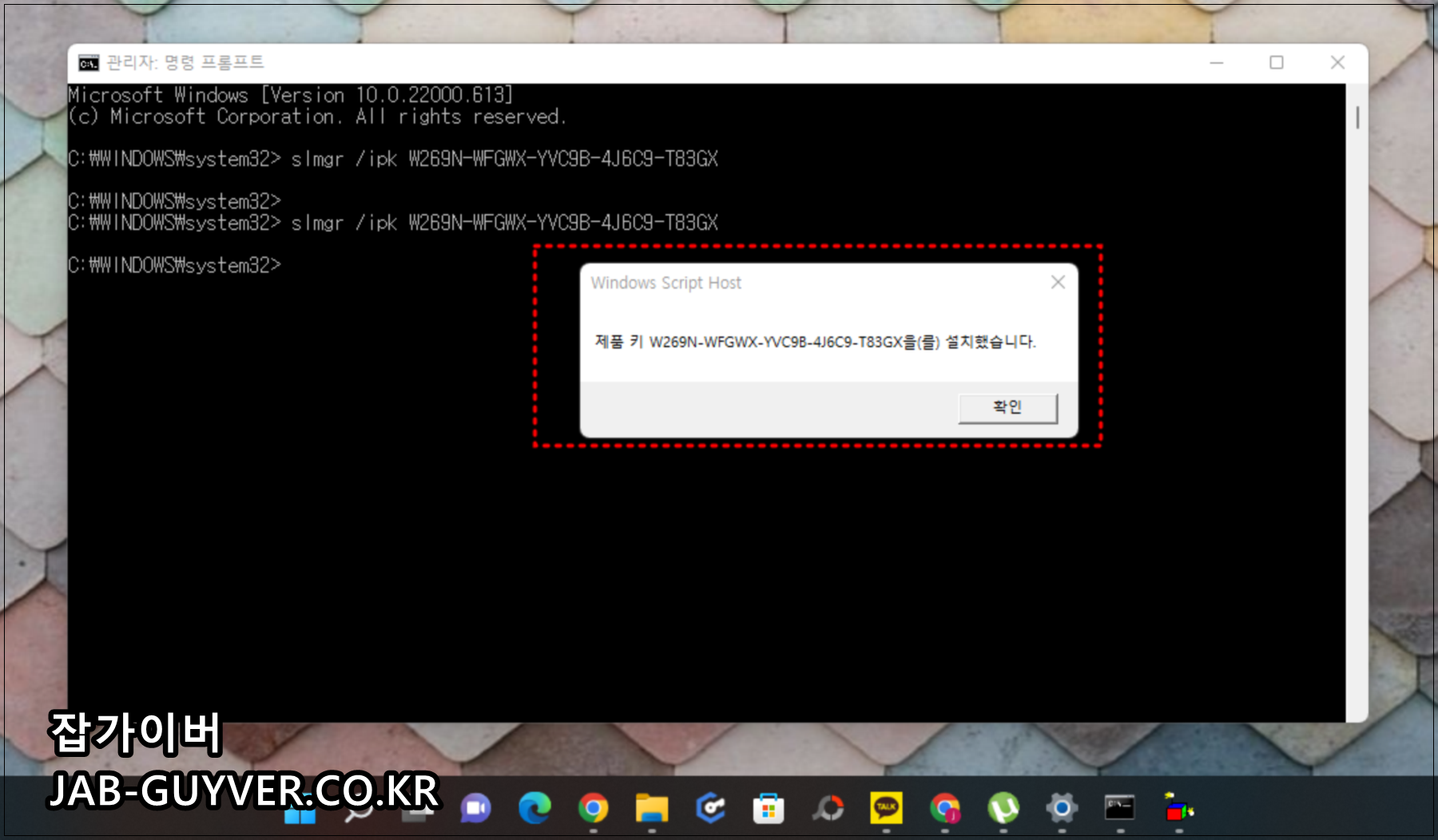 작은 도스창이 실행되면 현재 설치된 윈도우11 버전에 맞는 제품키를 입력합니다.