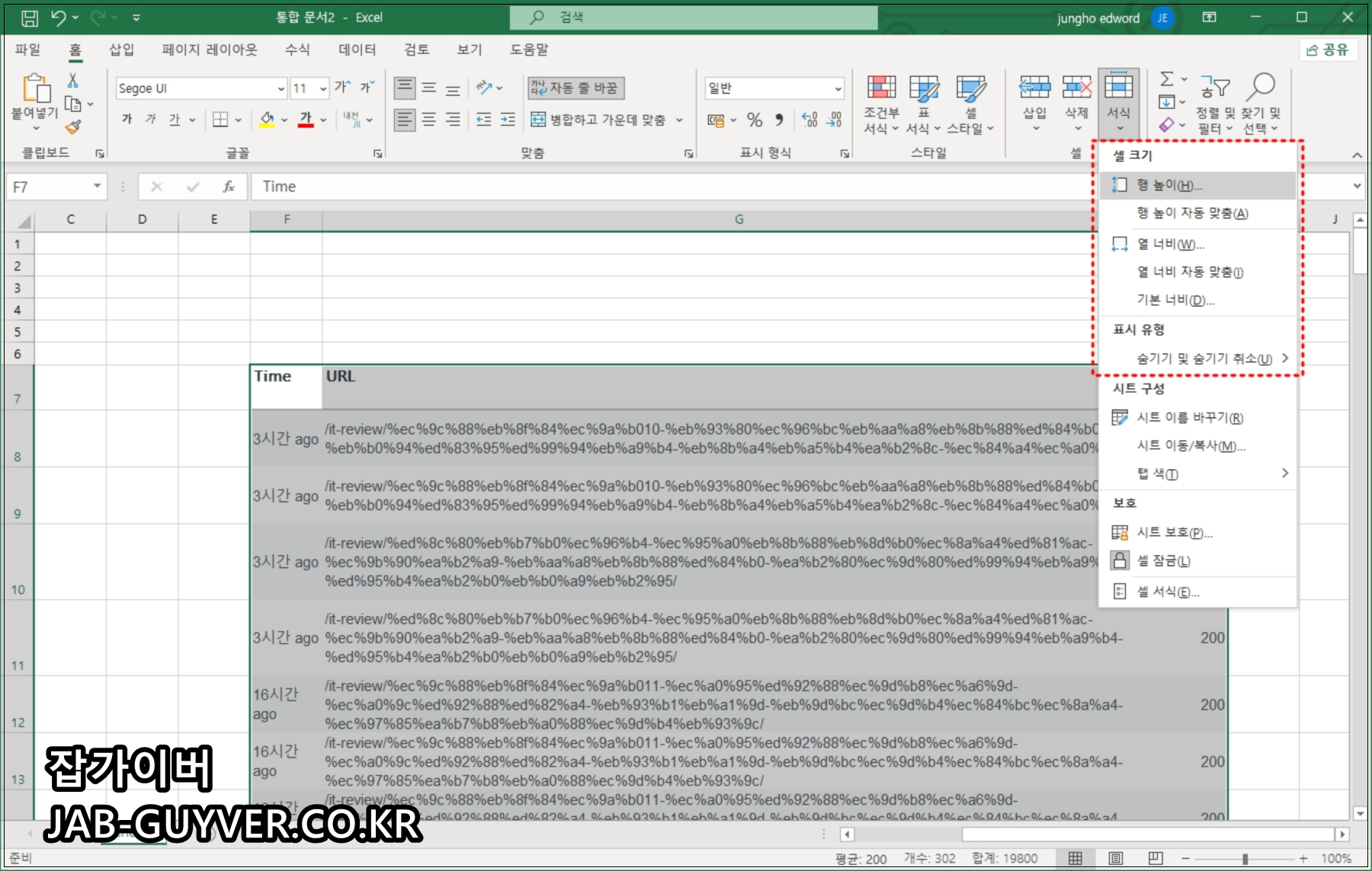 엑셀 홈 - 서식탭으로 이동하면 셀 크기를 높이 및 너비를 조절할 수 있으며 기본적으로 자동맞춤을 선택하면 현재 내용에 맞는 크기가 자동설정됩니다.