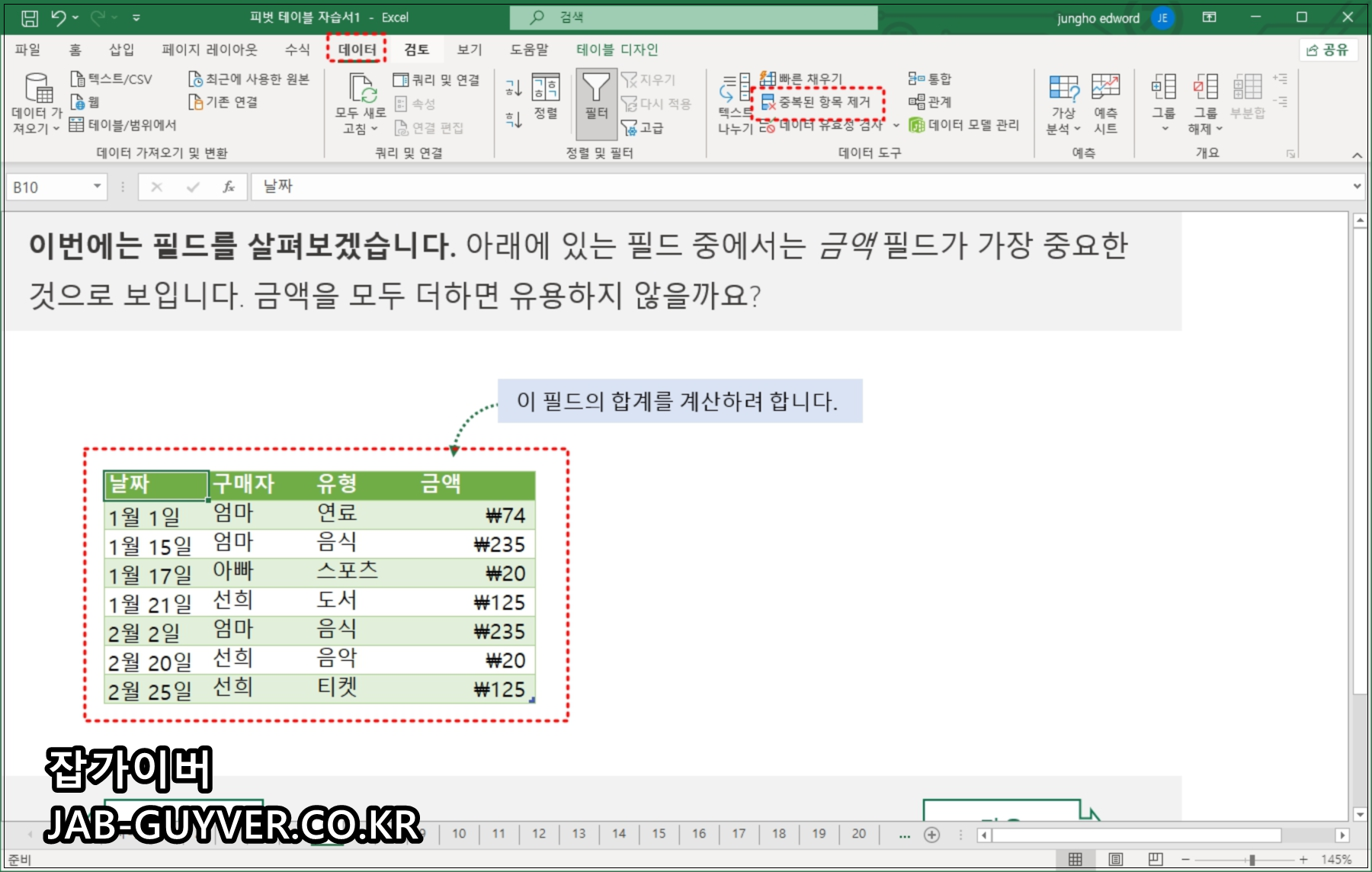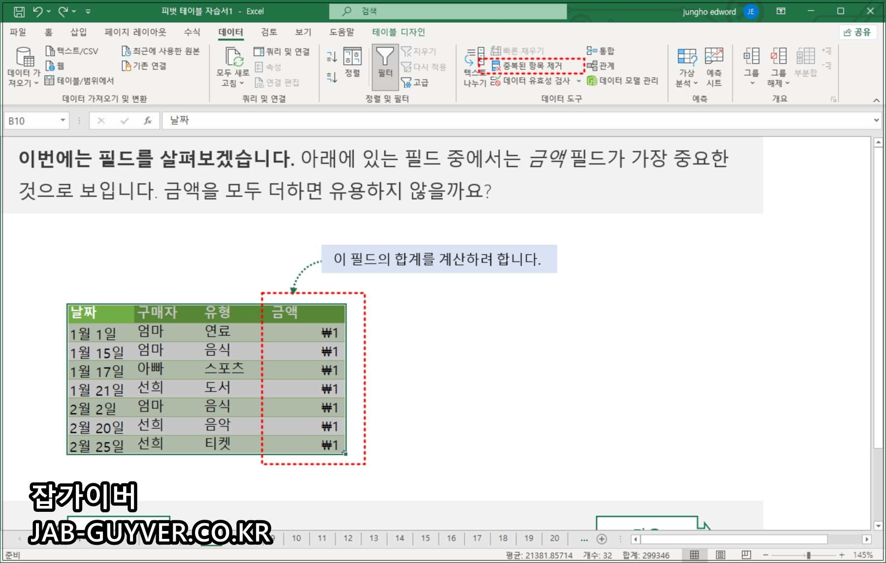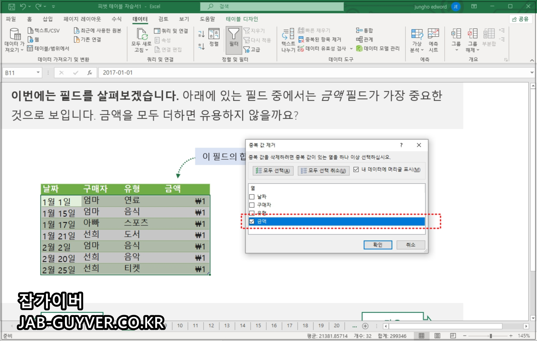 보느것과 같이 상단 목록 날짜, 구매자, 유형, 금액에 대한 항목을 찾아 중복된 값을 제거합니다.