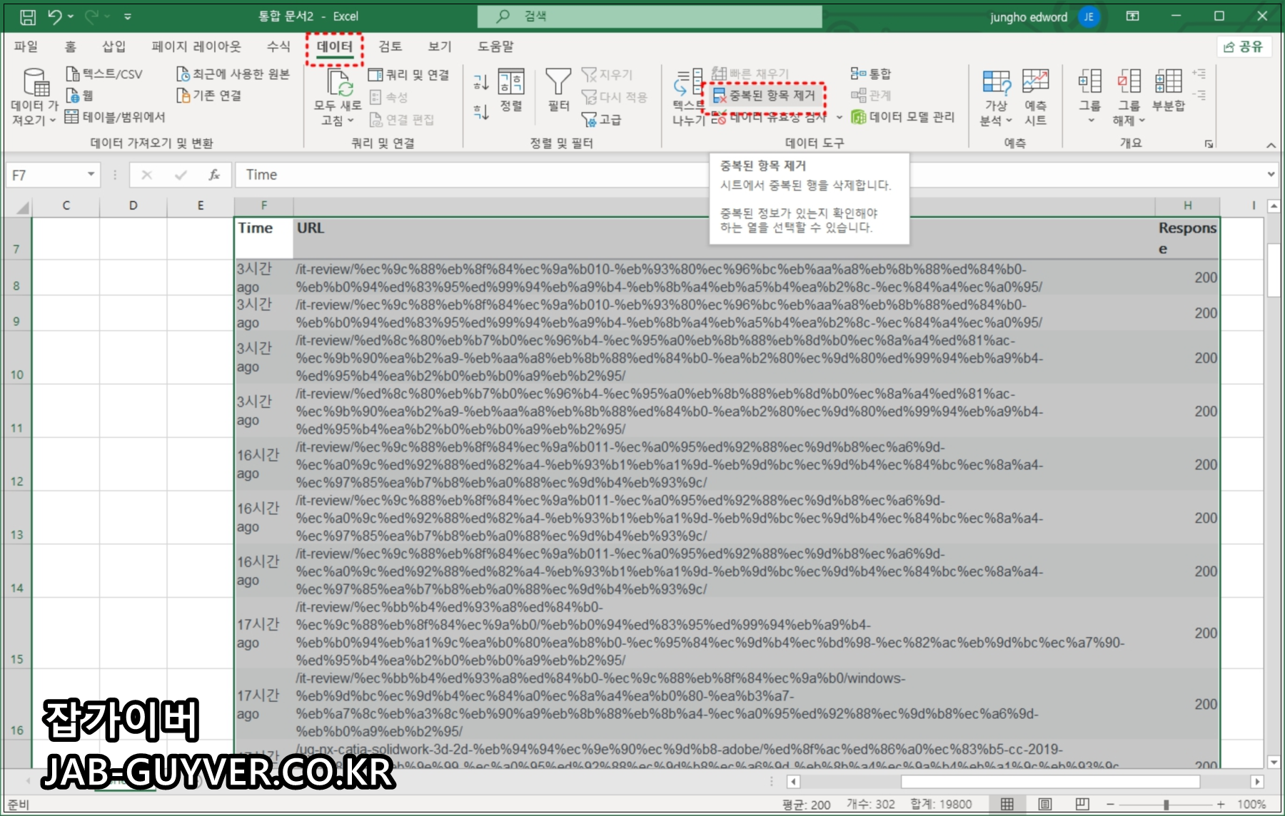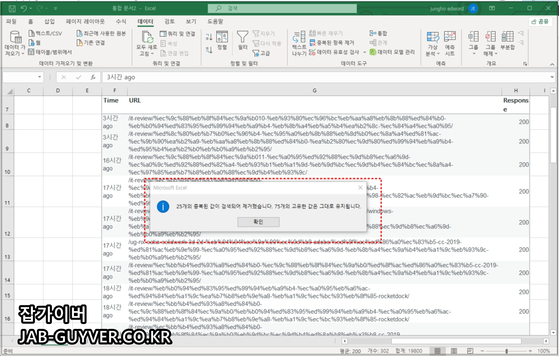 엑셀 중복된 항목 제거