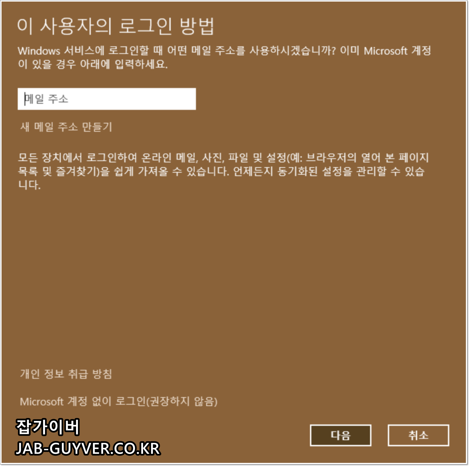 관리자계정을 추가하고자 한다면 자신의 메일주소를 통해 동기화할 수 있는 마이크로소프트 계정을 사용합니다.