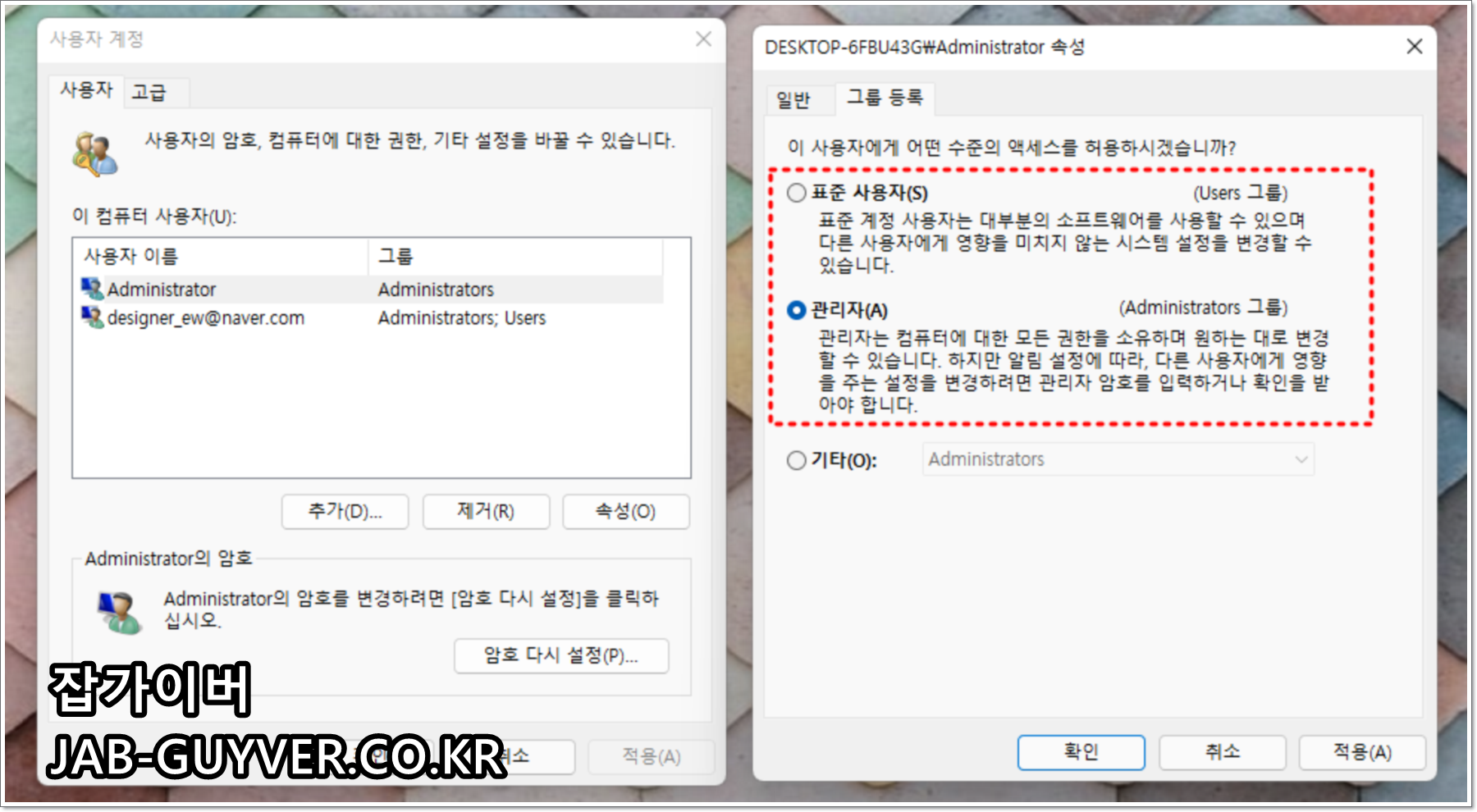 사용자계정 -> 속성 -> 그룹등록을 통해 일반사용자 및 관리자 그룹으로 변경합니다.