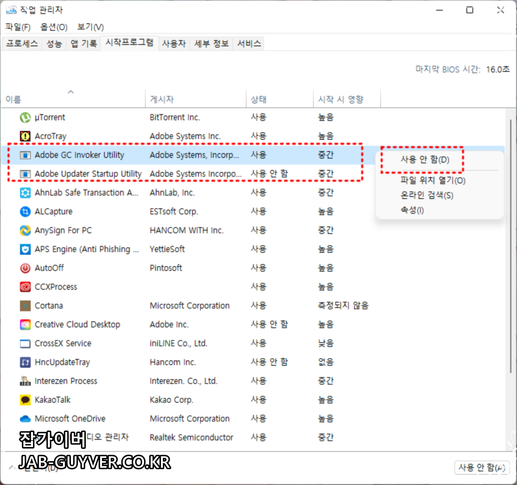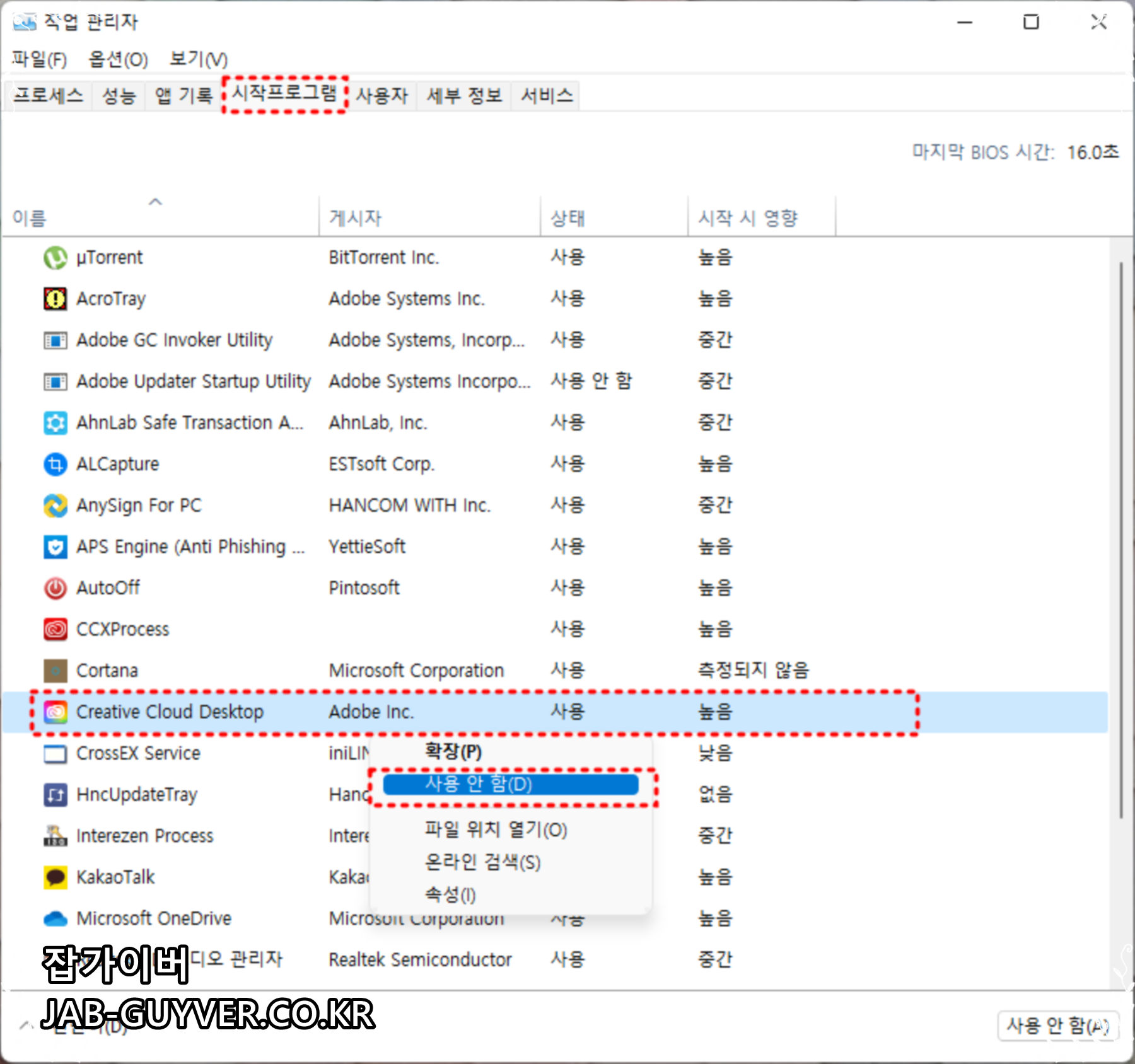 윈도우 부팅 시 Creative Cloud 업데이트 프로그램이 실행되지 않도록 사용안함으로 변경합니다.