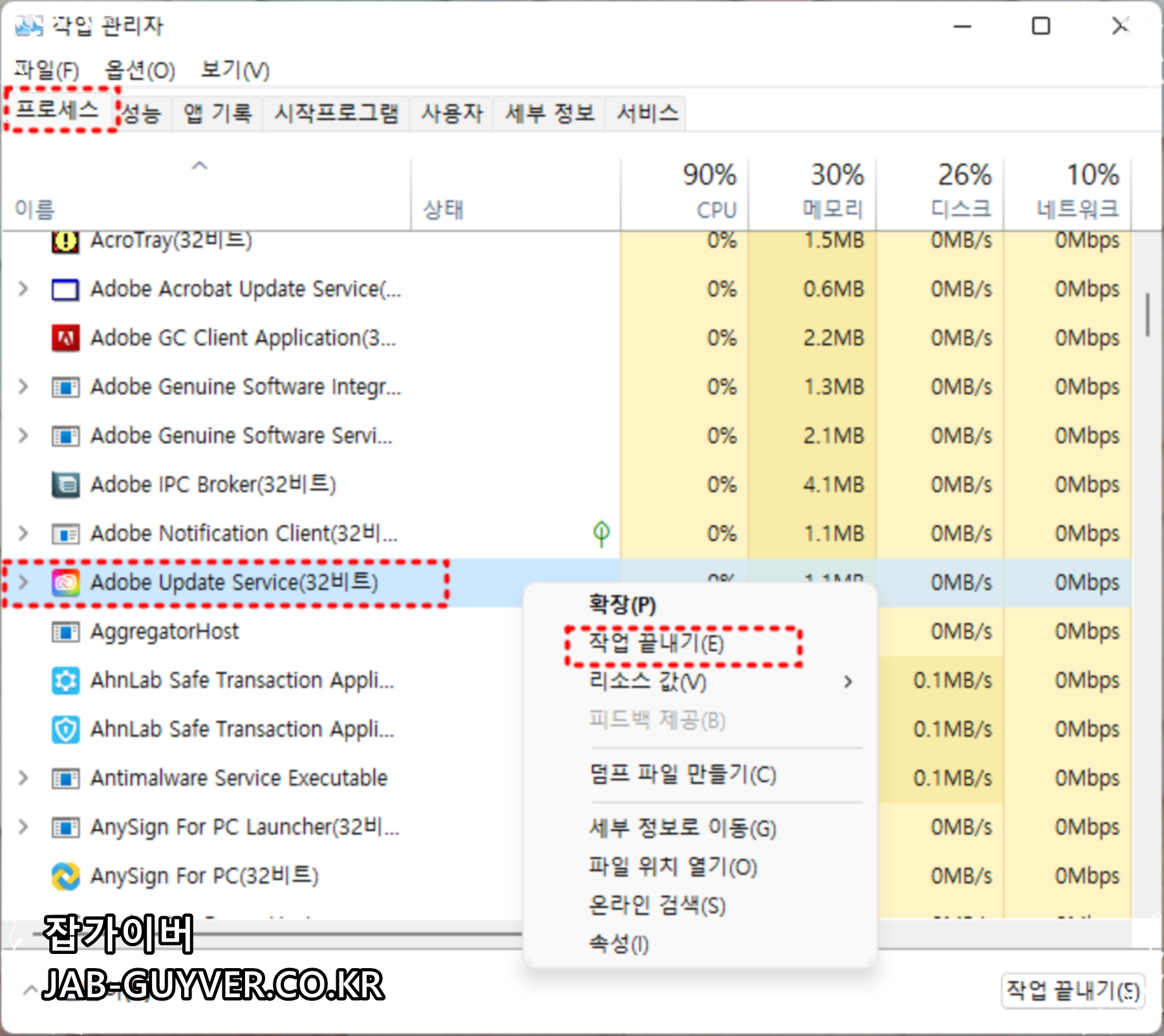 Adobe Creative Cloud 자동 업데이트가 실행중이기 때문에 작업관리자를 통해 프로그램을 강제로 종료합니다.